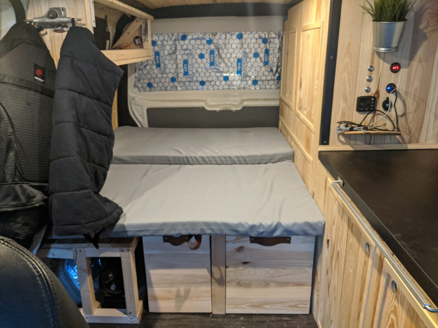 Innen habe ich Schränke aus Feder-Nut verbaut, ein ausziehbares Bett, eine Standheizung und diverse Schubladen. Später fand noch eine Kochstelle Platz und die Stromversorgung erfolgt über eine 120Ah Zweitbatterie.