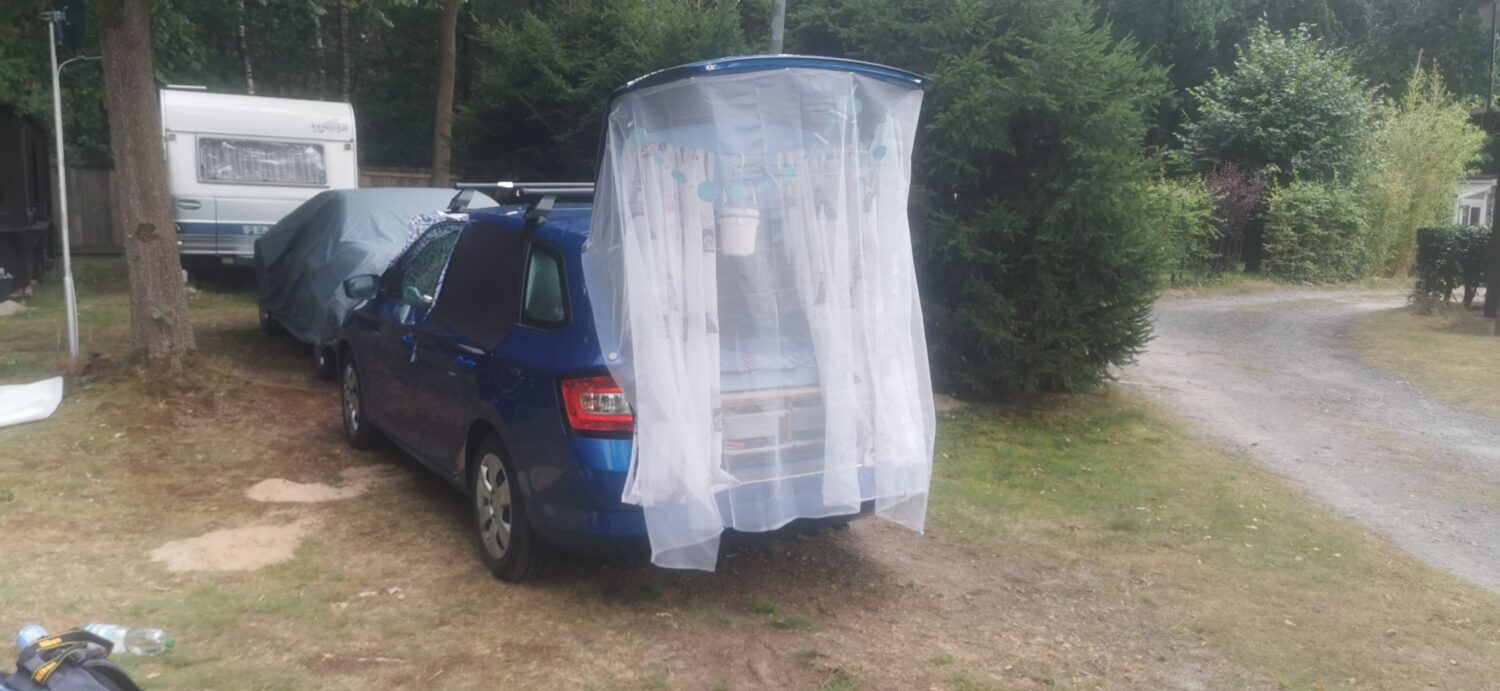 3 Wochen mit 1 Woche pause dazwischen Zusammen geklappt passt es in den Kofferraum Ausgeklappt 2 m x 1m liege fläche Kleiner Tisch und 2 Schrank klappen Im Kofferraum Bereich 1 schubladen Regal Viele Baustoffe sind secondhand so wie das schubladen Regal und einige Balken für die unterkonstruktion Kleine 20 l Campingdusche Surfboard dient auf dem Dach Träger wenn es dabei ist zusätzlich als mini Dachterrasse. Klein aber fein für kleine Abenteuer. Alles selbst entworfen von Idee über Bauplan Mini Modell bishin zum fertigen Ergebnis. Wird nach und nach noch mehr ausgestattet.