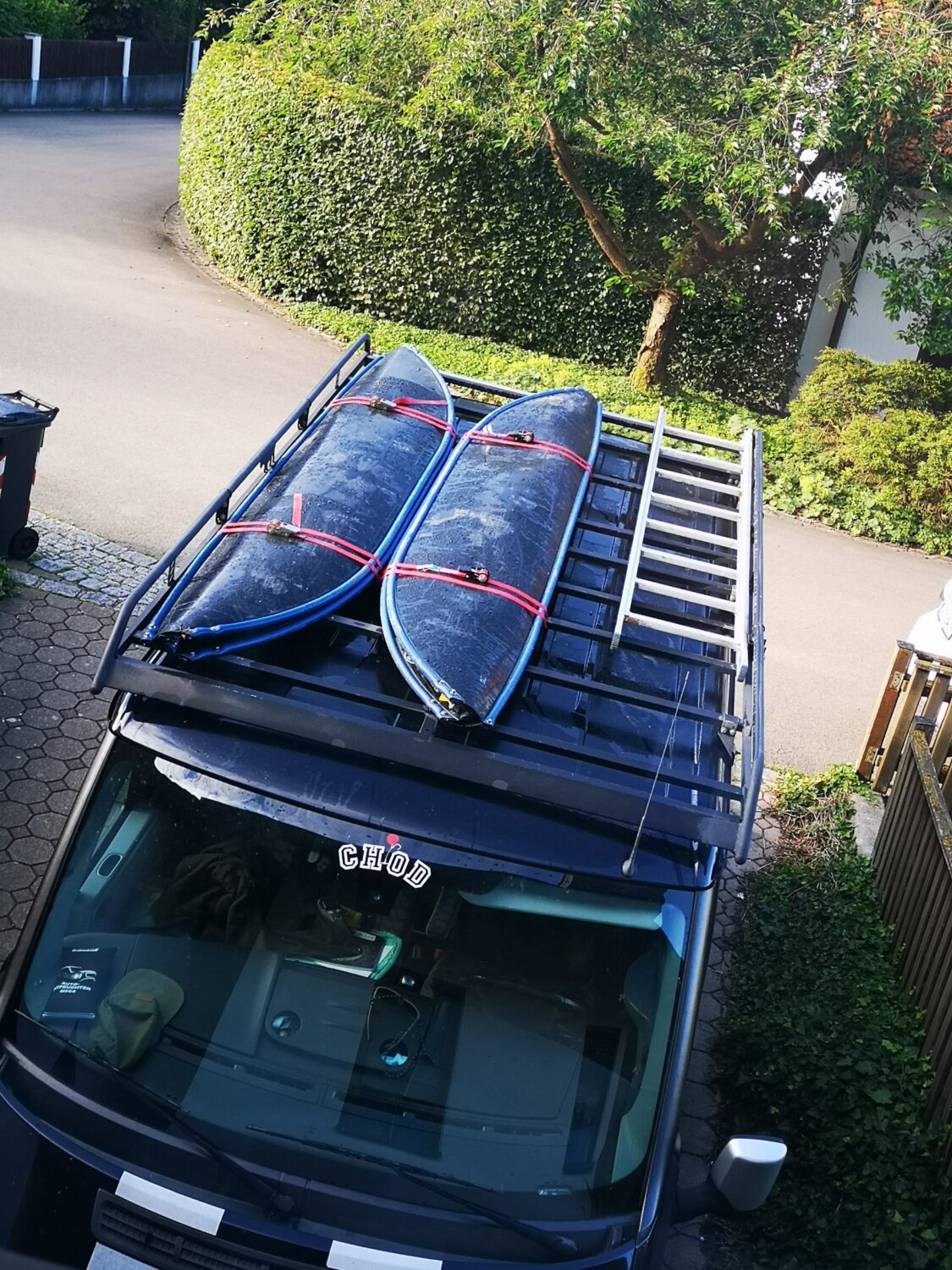 Der Ausbau ist recht minimal gehalten, da der Ladeplatz benötigt wird. Auf der Fahrerseite ist eine klappbare Liegefläche mit 60cm bzw. 120cm. Darunter befindet sich Stauraum für die Angelruten und ein kleiner Subwoofer. Auf dem Dachträger findet das Faltboot und eine Leiter Platz. Ansonsten ist der Innenraum gedämmt und schwarz gefilzt. Eine Markise und weitere Zusatzscheinwerfer sind auch geplant und hoffentlich auch bald montiert.