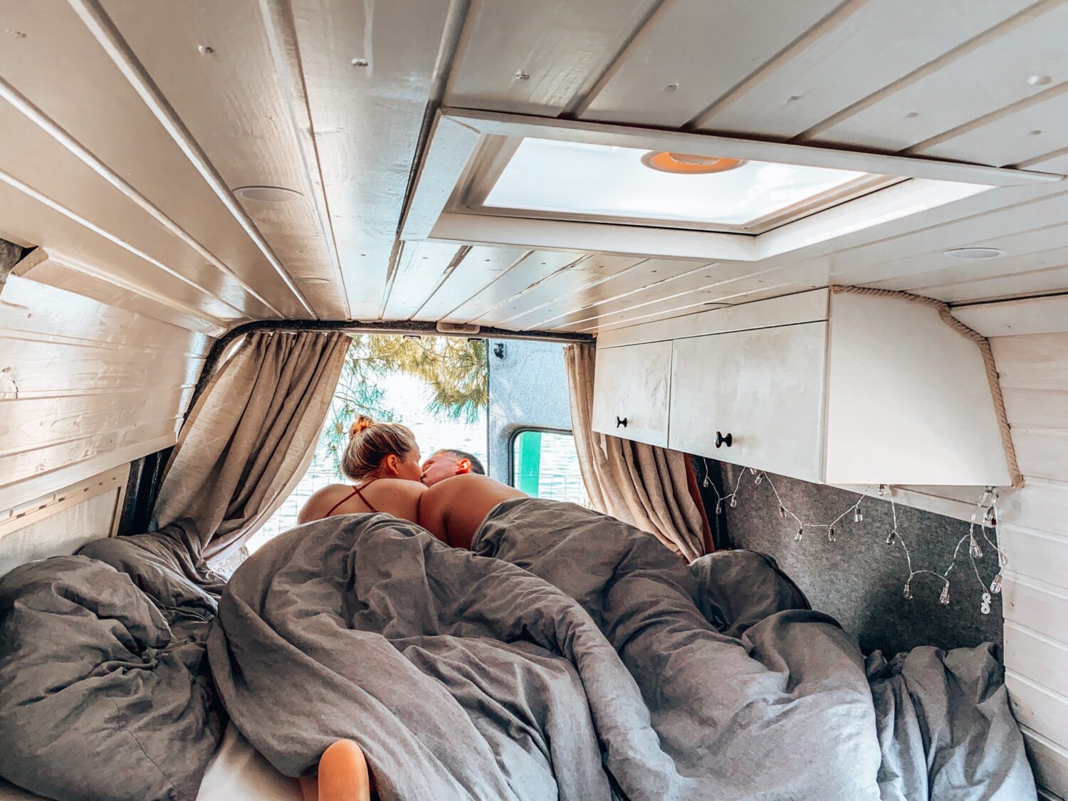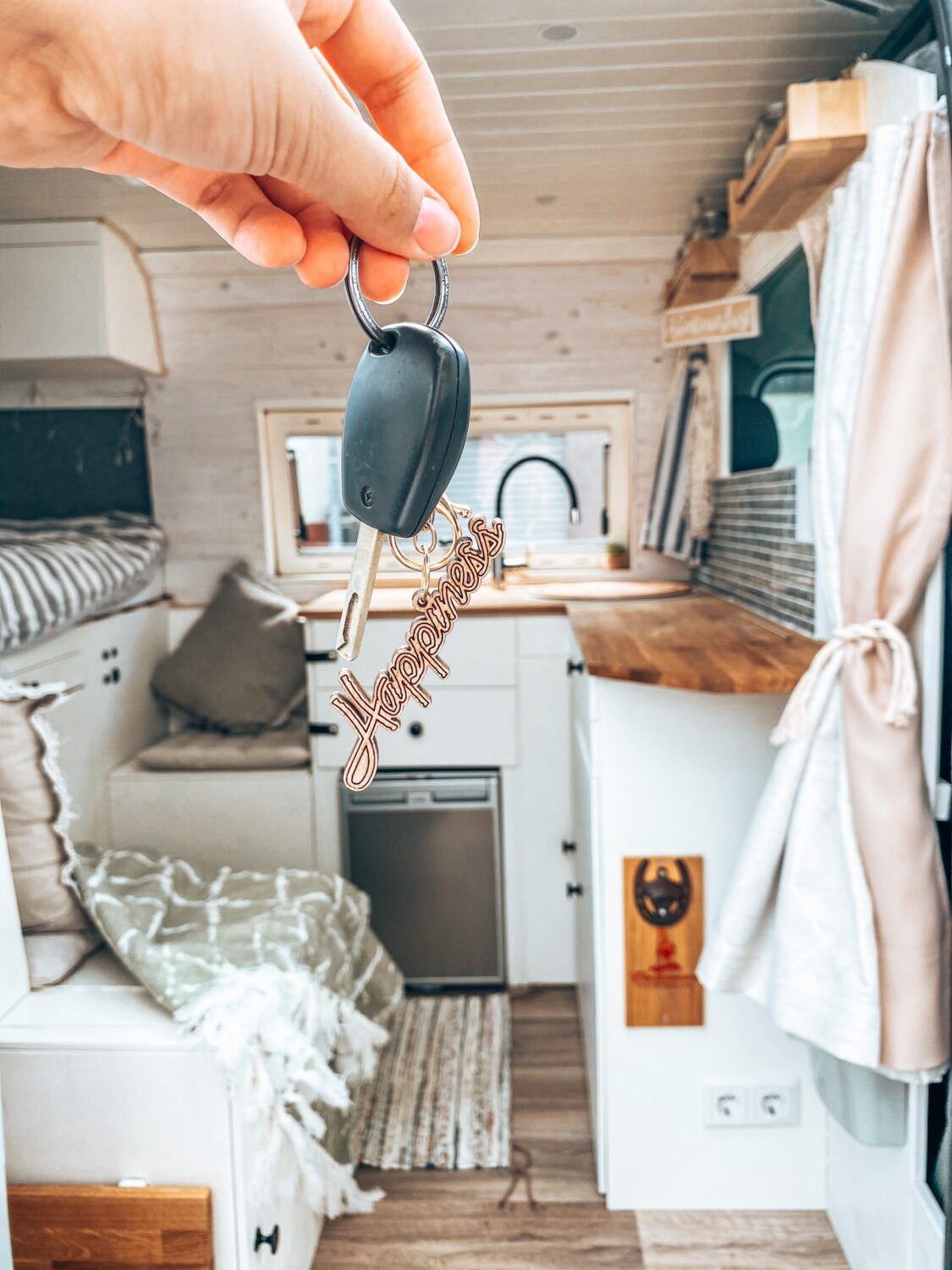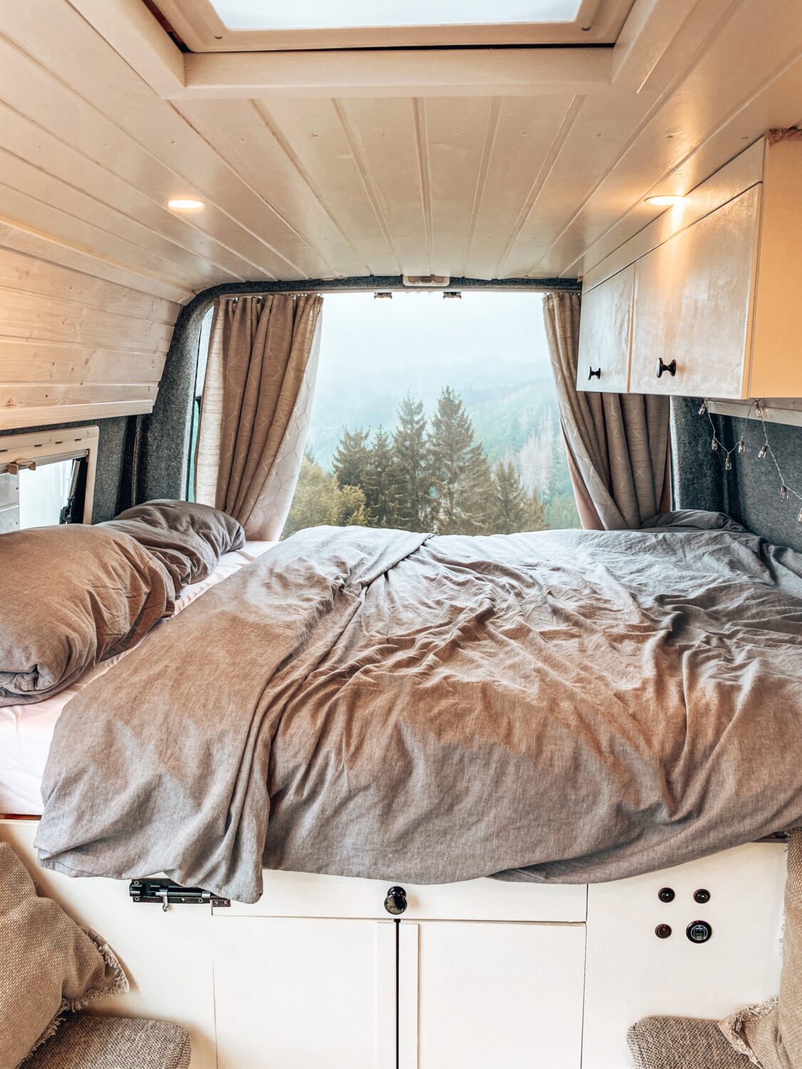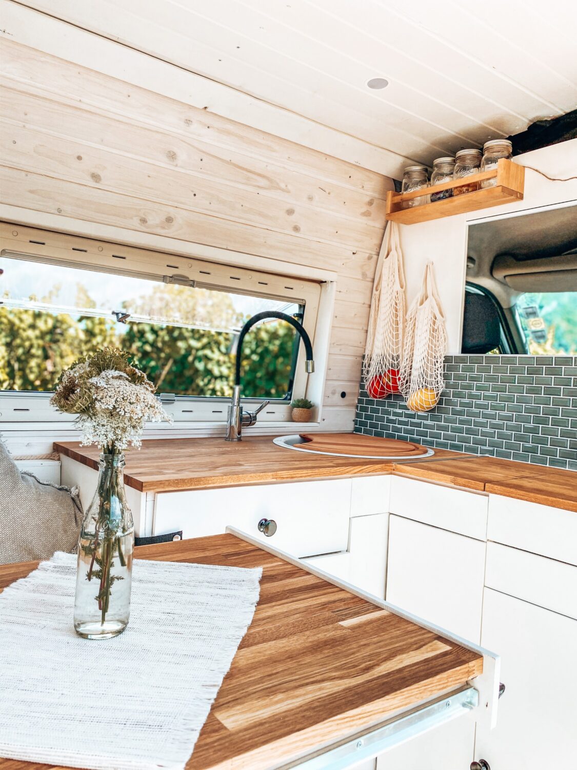 Unser Ausbau hat circa ein halbes Jahr gedauert. Wir haben keine Dusche/Nasszelle verbaut, dafür eine bewegliche Armatur in der Küche welche durchs Küchen-/Seitenfenster nach draußen gedreht werden kann und eine Campingtoilette in unserer Sitzbank verstaut. Die Solarpanele lassen uns immer autark stehen können!