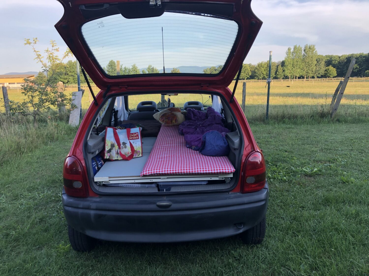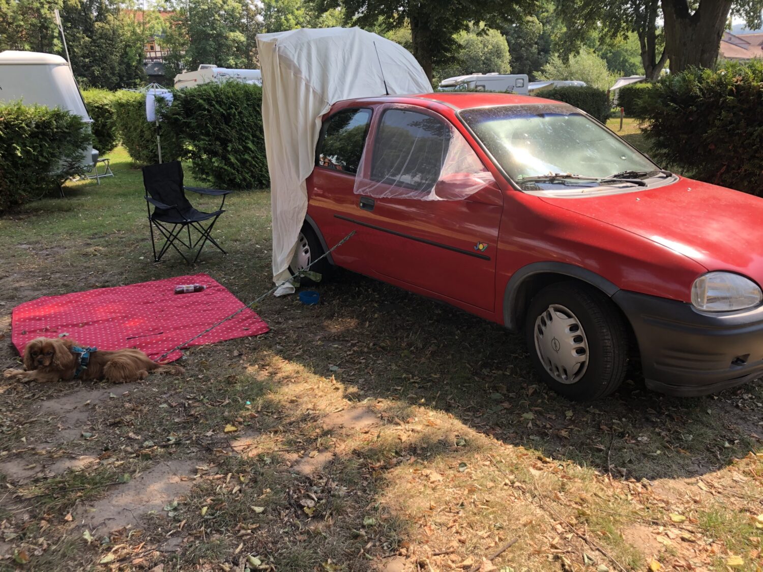 Im Juli 2020 zum Campingcorsa umgebaut nach dem Motto, arbeite mit dem was du hast. Ein Gestell für den Corsa ( Marke Eigenbau) zum Umbau habe ich durch Zufall im Internet gefunden und als Wink des Schicksals genommen und für 30 Euro abgeholt. Ein kleines Heckzelt habe ich selbst genäht, das wird in der Winterpause nochmal verbessert. Ich bin am ausprobieren, verwerfen und neu entdecken.