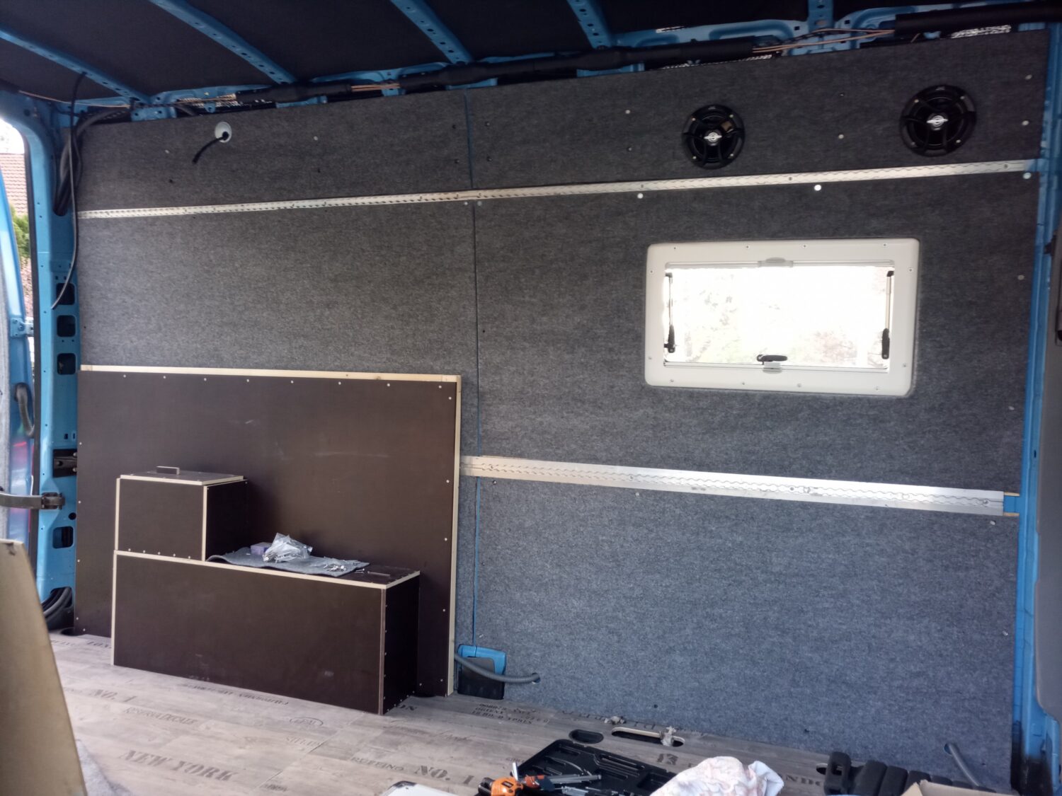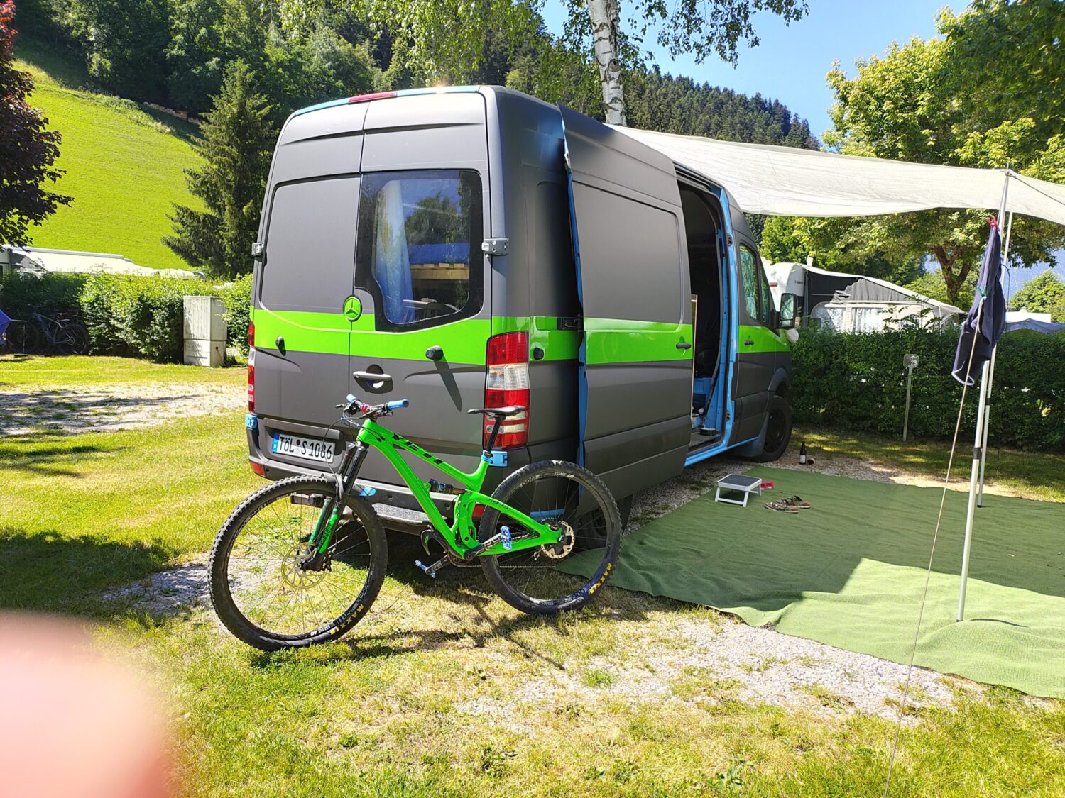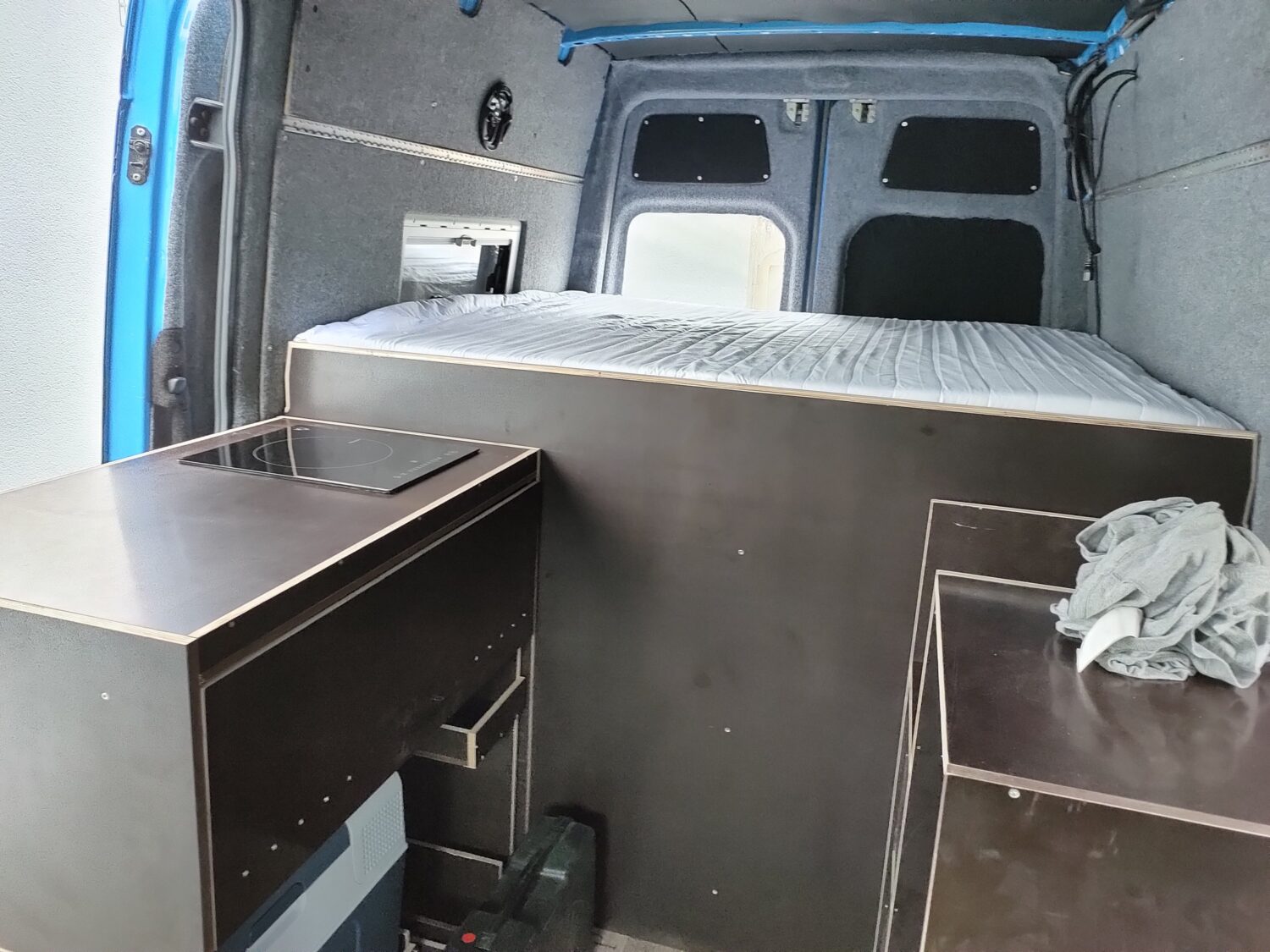 Insgesamt der dritte Bus den ich ausbaue, die ersten beiden waren VW Bullis (T5). Nachdem wir zukünftig zu dritt reisen werden, musste das Auto nun wachsen. Meine Philosophie für den Umbau. 80 % des Umbaus brachen 20% Zeit, die restlichen 20 % mach ich nicht…. Plan: Da das Auto auch für den ein oder anderen Tag „Home--Office herhalten muss, hab ich mich sehr mit der Technik gespielt. Fest verbautes WLAN und Smart Home Steuerung ist für mich aufgrund meines Berufs kein Problem. Vorbereitung für Beamer etc sind bereits eingeplant Wir stehen auf Camping Plätzen, habe also immer Strom (230V), somit kein Solar. Für die kalten Tage ist eine elektrische Fußbodenheizung als Wandheizung zweckendfremdet worden und bietet somit zwischen 5-15 C ein angenehmes Klima. Alles unterhalb hätten wir noch eine 5,5 KW Standheizung (ich frag mich warum diese vom Vorbesitzer eingebaut wurde). Frischwasser, Dusche, Toilette brauchen wir am Camping Platz auch nicht, daher wurde hierauf auch verzichtet. Wir fahren Räder die nicht günstig sind, ich wollte diese daher im Auto haben, eine Garage hierfür ist unter dem Bett. Kosten: Gesamtkosten lagen bei rund 7.000 Euro inkl. Fahrzeug (exkl. Kühlschrank der schon vorhanden war). Auch hier bin ich der Meinung das es sicher besser und schöner geht, aber jeder baut seit Auto und darf das selbst entscheiden. Kommendes Jahr kommen noch andere Reifen und ein Zusatzsitz hinzu (geplante Kosten rund 2.000 Euro). Arbeitszeit: Ich will es nicht wissen das ich es als Spaß und Freizeit betrachte aber ich schätze auf ca. 120 h. Meine Fehler: Mit den Fenstern bin ich nicht zufrieden, diese sind zu klein und falsch positioniert. Das Bett hätte 10 cm niedriger sein können. Ein Dachfenster kommt ggfs. kommendes Jahr noch und das Fenster im Heck würde ich nicht mehr aus Glas nachrüsten.