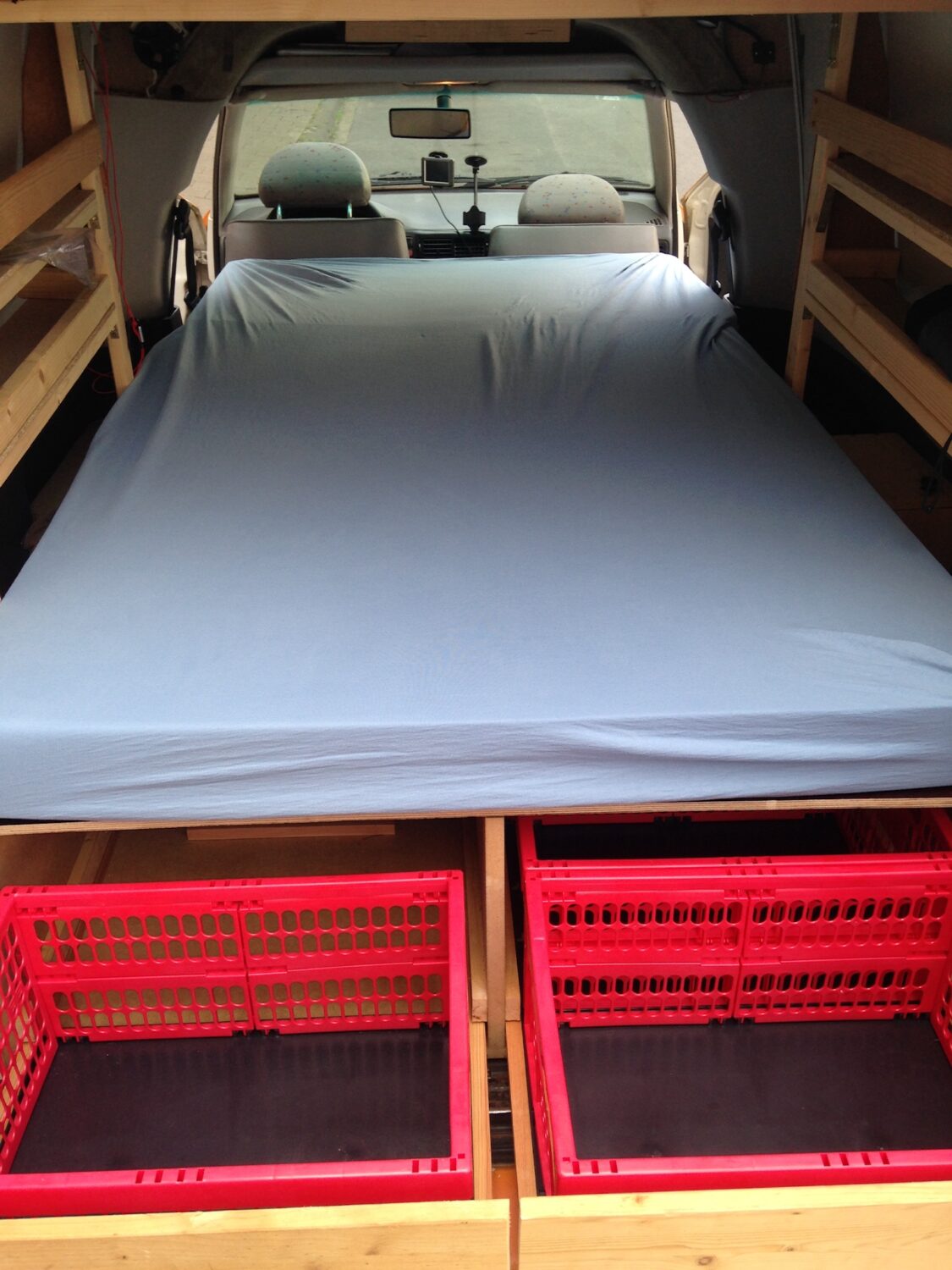 Der Caddy war ein Sponatnkauf und die Ausstattung eigentlich eher so als Provisorium gedacht für einen ersten Trip und in 2 Wochen zusammengeschraubt. Mittlerweile habe ich mich entschieden es so zu lassen und zu ergänzen. Alles habe ich selber entwickelt, da es nicht viele Camper von dem Modell gibt und ich niemanden gefunden habe der diesen Caddy für 2 Schlafplätze ausgebaut hat . Stolz bin ich auf meinen Bettkasten der mir besonders viel Stauraum bietet. Um autark sein zu können habe ich mir eine 2. Batterie verbaut mit einem 12V Stromkreis für eine kleine Kühlbox. Mittlerweile habe ich auch seit 3 Wochen ein Dachterrasse. Alles in allem habe ich in den Ausbau und Umbau so 600€ Investiert.