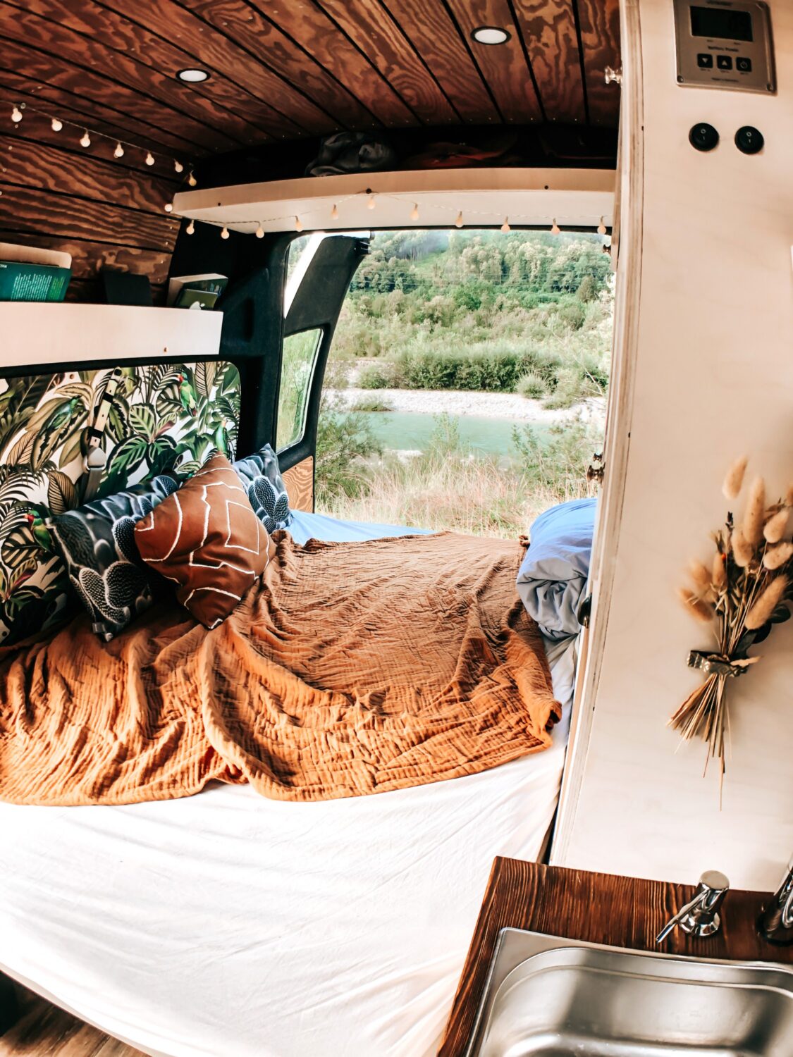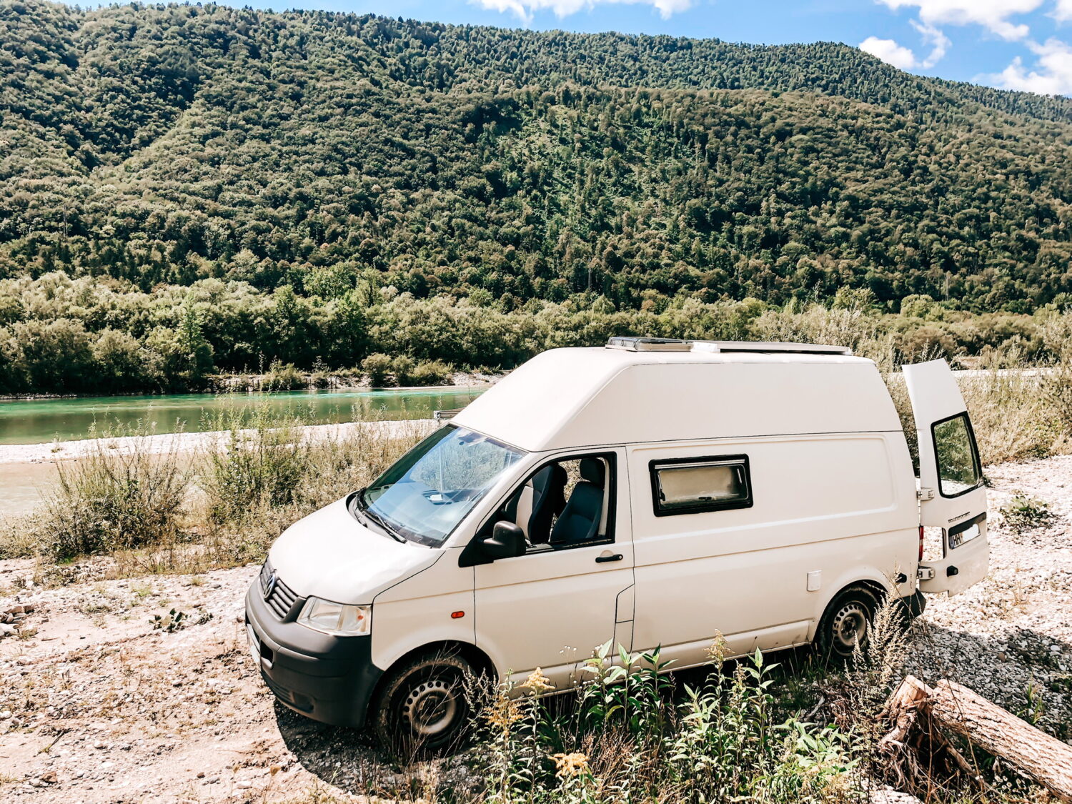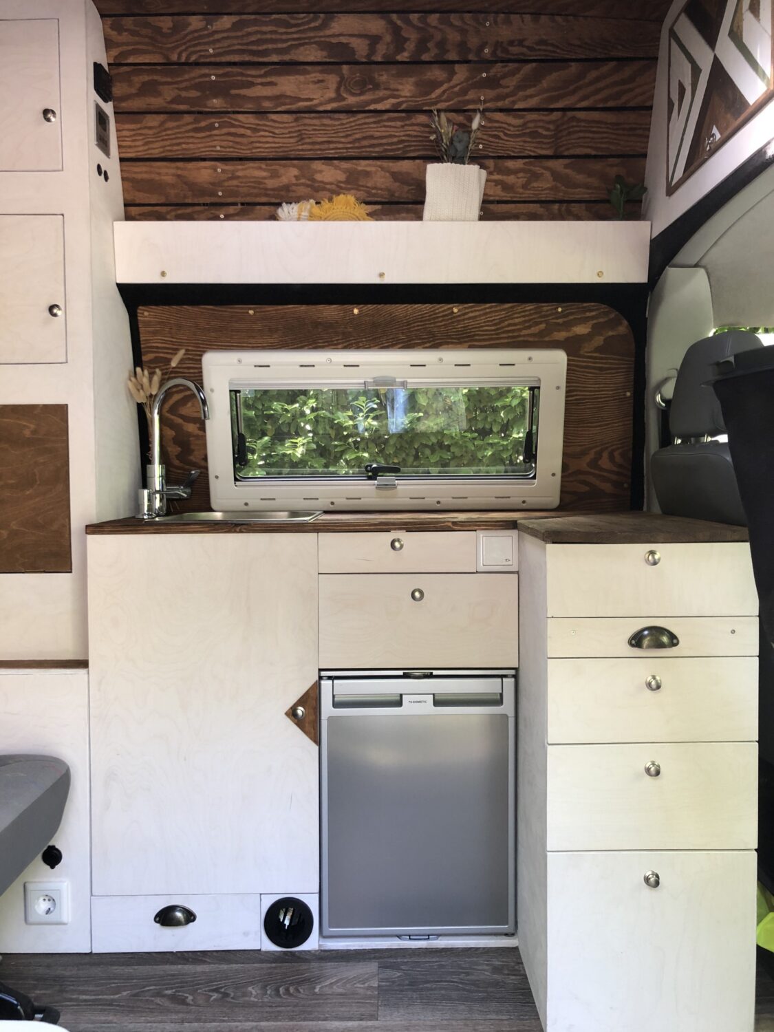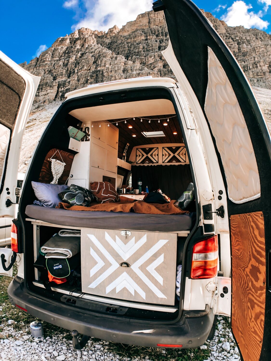 Wir haben unseren Bus im August 20109 als komplett leeren Transporter gekauft. Wichtig war uns das Hochdach, ein langer Radstand, der Motor (2,5 TDI mit 130 PS), sowie ein Allrad-Antrieb. Mit Hilfe eines befreundeten Mechanikers haben wir zuerst eine Sitzbank nachgerüstet. Dies hat viel Recherche erfordert, da wir alle Nummern der Original VW-Teile heraussuchen mussten. Zum Glück hat aber alles geklappt, und wir haben sie inzwischen sogar vom TÜV abnehmen lassen und damit nun 4 eingetragene Sitzplätze. Die Doppelsitzbank vorne haben wir nämlich gegen einen Einzelsitz mit Drehkonsole getauscht. Anschließend haben wir ein Dach- und Seitenfenster, sowie Scheiben in die Hecktüren eingesetzt. Wichtig waren uns außerdem eine Standheizung, Markise, Kompressorkühlschrank, 150Ah Lithium Batterie,150 Watt Solar, Landstrom und ein 230V Wechselrichter. Für den gesamten Umbau haben wir ungefähr 1 Jahr gebraucht. Für den Möbelbau haben wir 12mm und 18mm Multiplex, sowie 4mm und 6mm Sperrholz für die Decken- und Seitenverkleidungen verwendet. Unser Bett bildet in eingeklapptem Zustand im Heck ein Sofa. Im ausgezogenen Zustand liegt es dann dann auf der umgeklappten Sitzbank, dem Schuhregal links und einem Vorsprung des Schrankes rechts davon auf. Das alles lässt sich innerhalb weniger Sekunden umbauen :) Wir haben 30L Frisch- und 13L Abwasser an Board. Im Heck haben wir eine Schublade mit einem Schwerlastauszug verbaut, die uns einerseits viel Stauraum bietet und auf welchem außerdem unser Campingkocher seinen festen Platz hat.