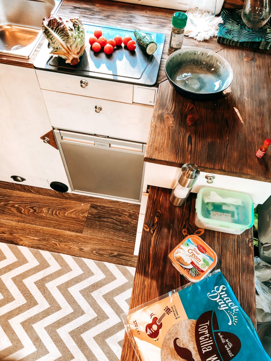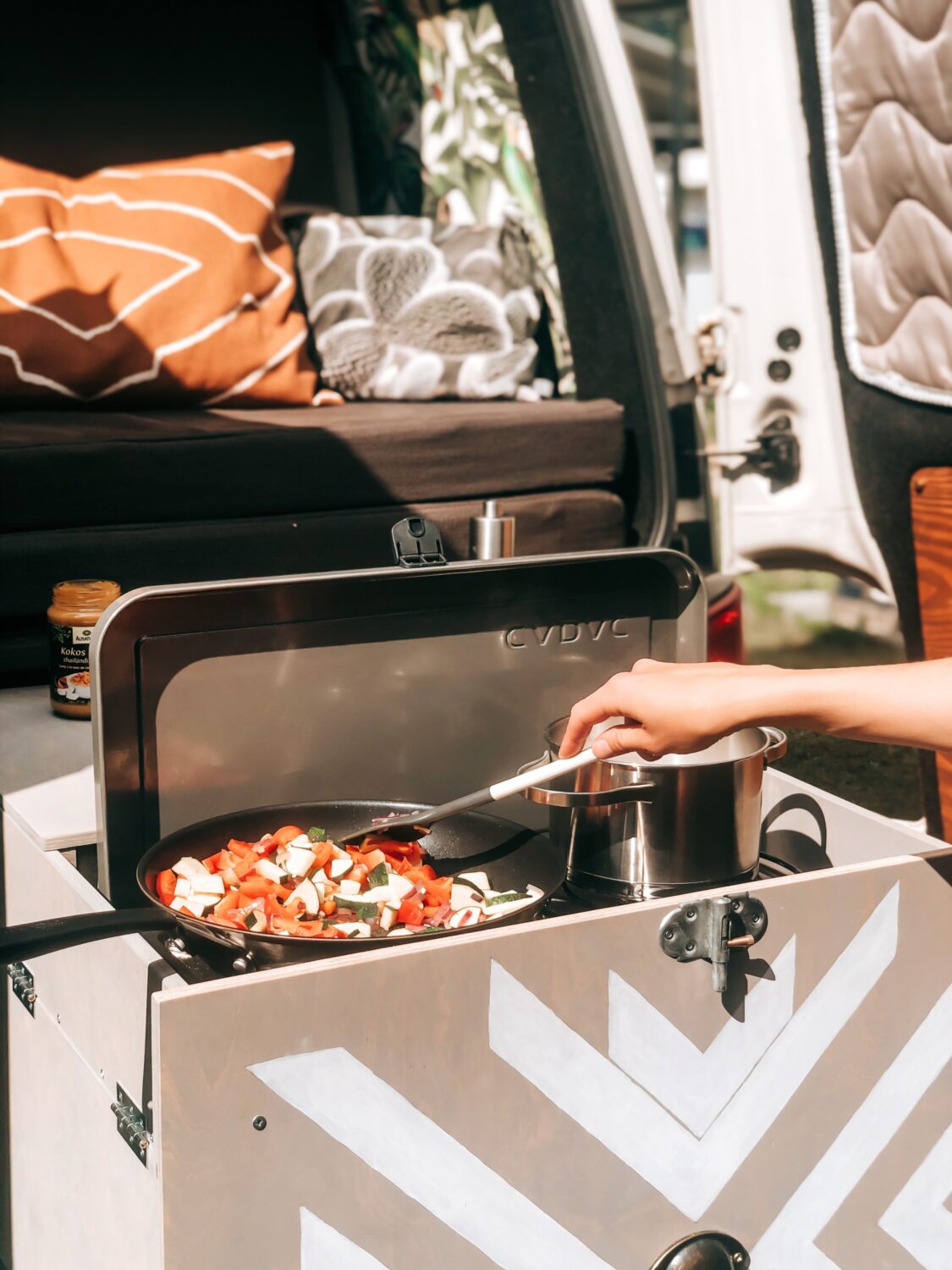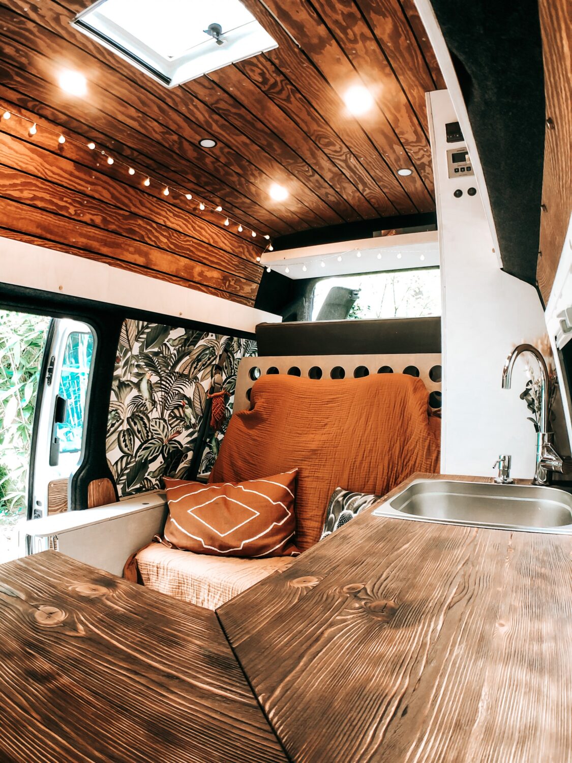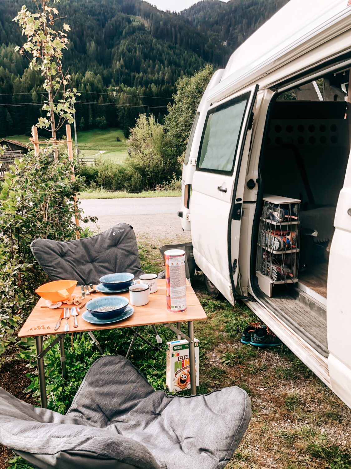 Wir haben unseren Bus im August 20109 als komplett leeren Transporter gekauft. Wichtig war uns das Hochdach, ein langer Radstand, der Motor (2,5 TDI mit 130 PS), sowie ein Allrad-Antrieb. Mit Hilfe eines befreundeten Mechanikers haben wir zuerst eine Sitzbank nachgerüstet. Dies hat viel Recherche erfordert, da wir alle Nummern der Original VW-Teile heraussuchen mussten. Zum Glück hat aber alles geklappt, und wir haben sie inzwischen sogar vom TÜV abnehmen lassen und damit nun 4 eingetragene Sitzplätze. Die Doppelsitzbank vorne haben wir nämlich gegen einen Einzelsitz mit Drehkonsole getauscht. Anschließend haben wir ein Dach- und Seitenfenster, sowie Scheiben in die Hecktüren eingesetzt. Wichtig waren uns außerdem eine Standheizung, Markise, Kompressorkühlschrank, 150Ah Lithium Batterie,150 Watt Solar, Landstrom und ein 230V Wechselrichter. Für den gesamten Umbau haben wir ungefähr 1 Jahr gebraucht. Für den Möbelbau haben wir 12mm und 18mm Multiplex, sowie 4mm und 6mm Sperrholz für die Decken- und Seitenverkleidungen verwendet. Unser Bett bildet in eingeklapptem Zustand im Heck ein Sofa. Im ausgezogenen Zustand liegt es dann dann auf der umgeklappten Sitzbank, dem Schuhregal links und einem Vorsprung des Schrankes rechts davon auf. Das alles lässt sich innerhalb weniger Sekunden umbauen :) Wir haben 30L Frisch- und 13L Abwasser an Board. Im Heck haben wir eine Schublade mit einem Schwerlastauszug verbaut, die uns einerseits viel Stauraum bietet und auf welchem außerdem unser Campingkocher seinen festen Platz hat.