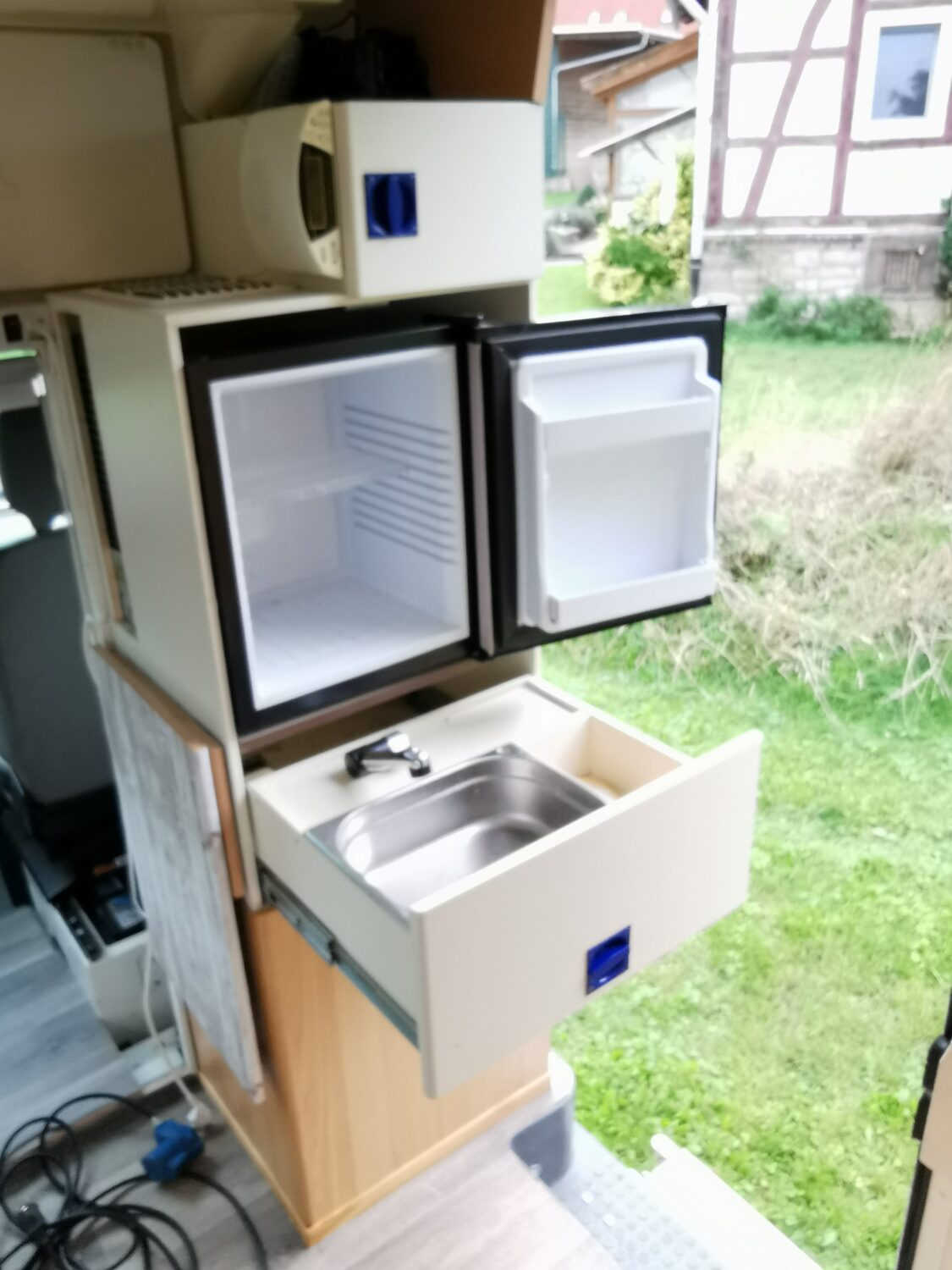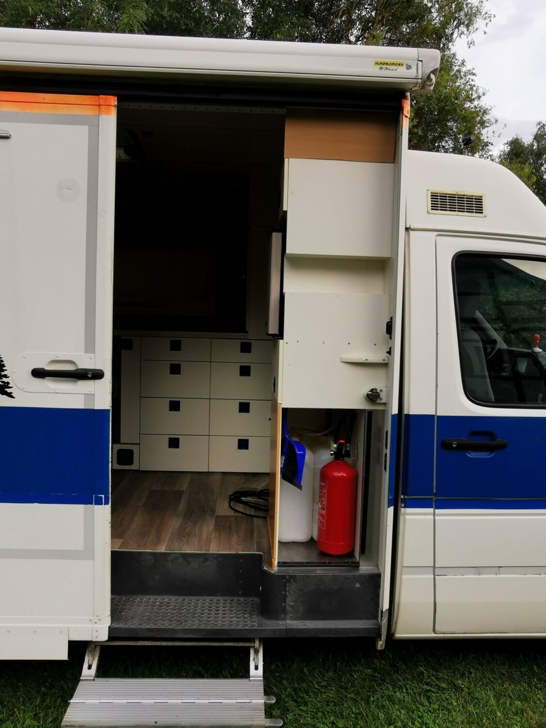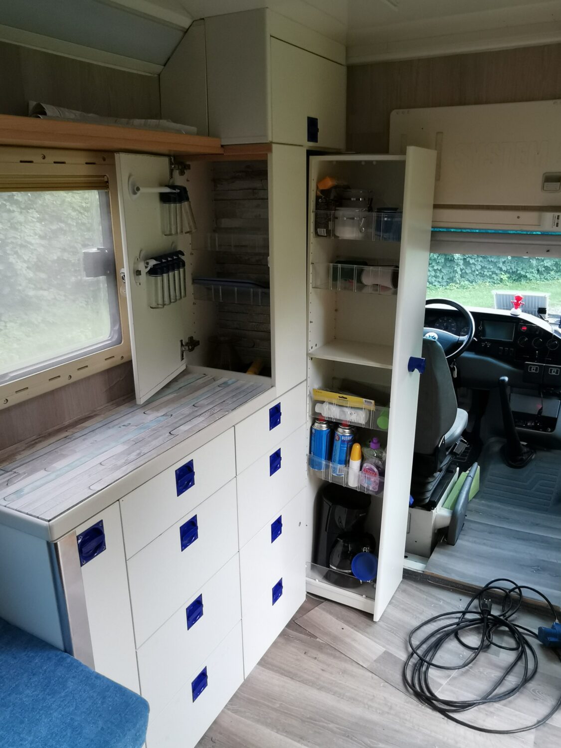 Wir haben den RTW seit 2014 Ein teil der Ausstattung aus dem RTW haben wir behalten, es wäre ja eine Schande die Profischränke weg zu schmeißen. Eingebaut haben wir eine Sitzgruppe in u form die durch eine Mittelplatte in ein 160cmX190cm großes Bett umgebaut werden kann. Einen Kühlschrank von Klarstein und eine Spüle zum abwaschen und für eine Katzenwäsche ist verbaut, eine dusche haben wir nicht dabei da wir meistens auf Campingplätzen stehen und dort duschen. Für die grobe Dusche ist eine Außendusche mit da bei. Als Toilette haben wir ein Portapotti an Bort welches bei Standzeiten im abgedunkelten Fahrerhaus zwischen den Sitzen steht , das wir mit einem Rollo abtrennen können.