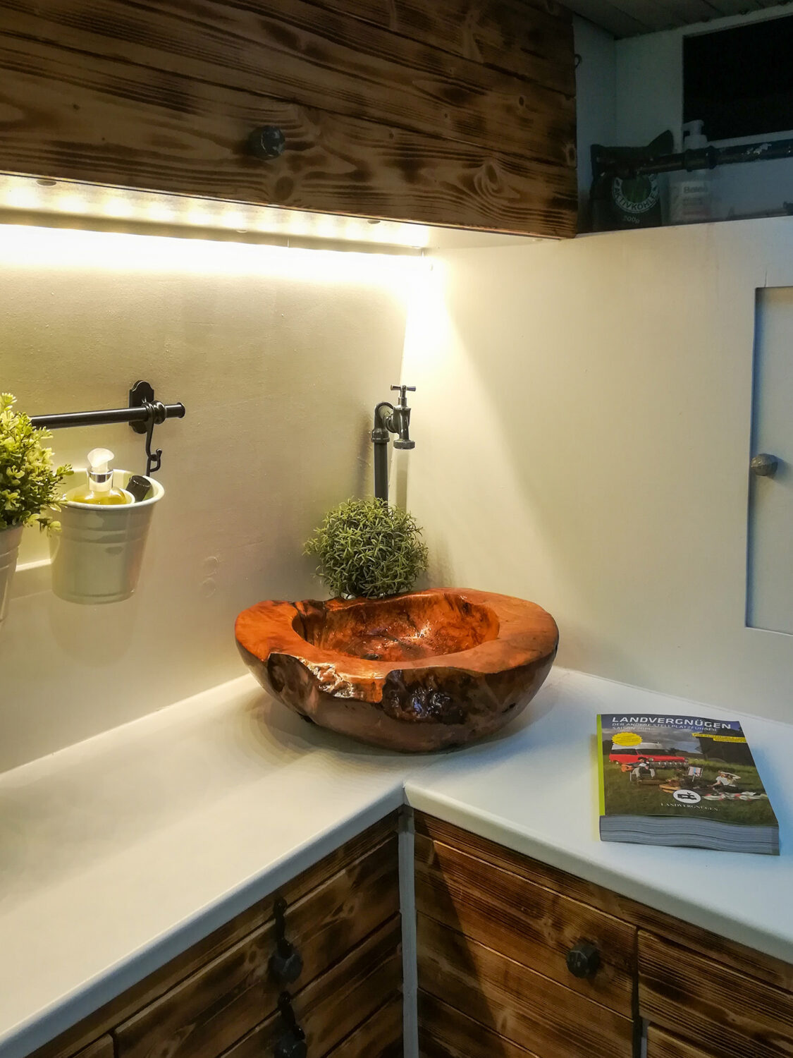 Fred wurde von den Vorbesitzern ausgebaut. Nach und nach haben wir einige Details verändert aber im Großen und Ganzen ist Fred so geblieben. Auf dem Dach sind zwei Solarpanele montiert, zudem haben wir zwei Gelbatterien verbaut. Zwei 20 l Wassertanks für Frisch- und Abwasser und eine hübsche Holzschale als Spüle sind dekorativ in einem Küchenblock verbaut. Die geflammten Holzschränken sind ein toller Hingucker zum sonst weiß gehaltenen Innenleben. Im Heck befindet sich noch ein kleiner Wasserkanister mit Pumpe den wir als Außendusche nutzen können. Ein Kompressorkühlschrank und eine Dieselheizung komplettieren die Ausstattung. Zusätzlich haben wir uns noch eine Campingtoilette zugelegt, damit wir auch autark stehen können.