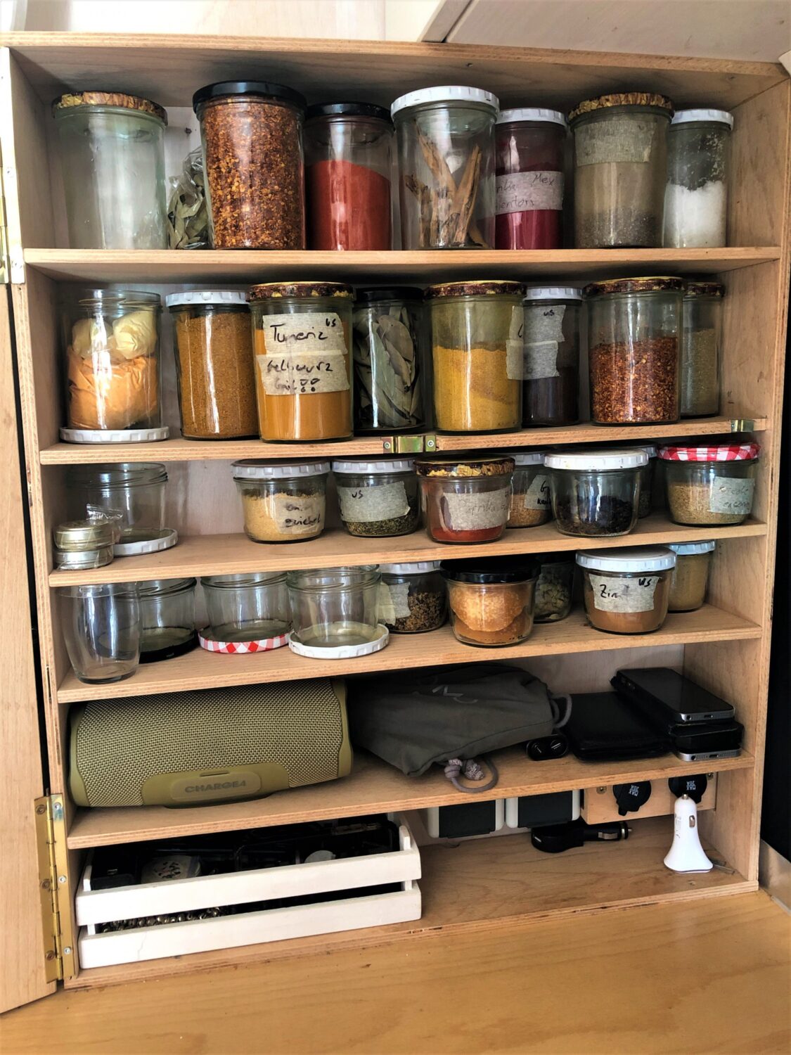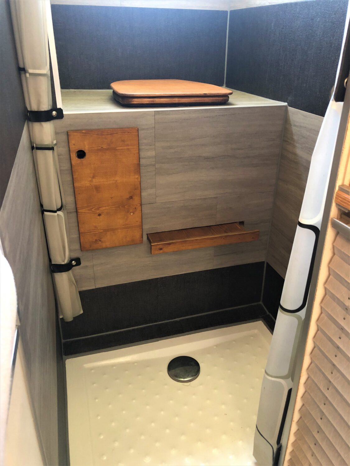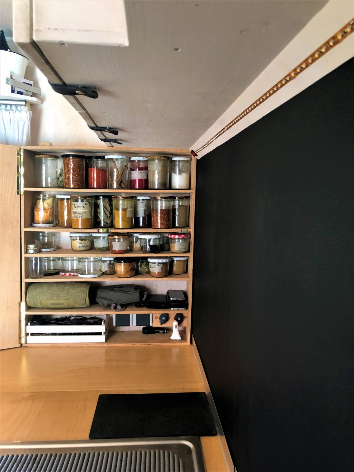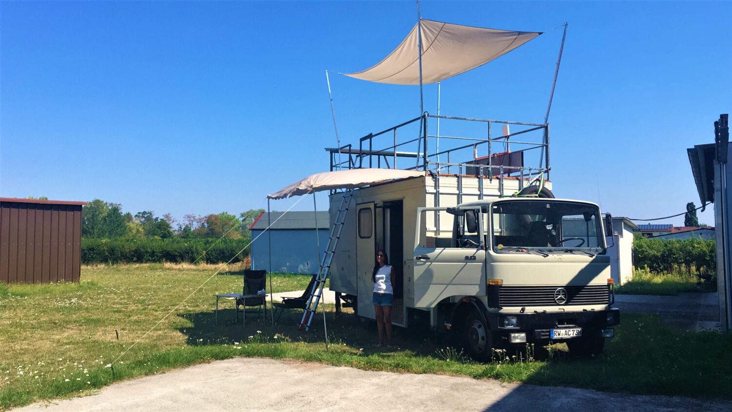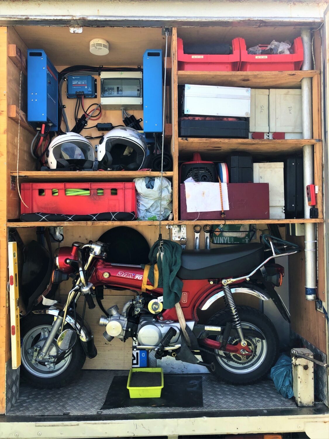 Der gesamt Ausbau hat über ein Jahr gedauert, da wir alles selbst gebaut haben. Unsere Auto ist Autark und hat eine integrierte Mopedgarage mit Seilwinde für unsere Honda Dax. Solaranlage, 300 Liter Wassertanks, Dusche, Trockentoilette und unser ganzer Stolz ist die aufklappbare Dachterrasse mit Holzboden und Sonnensegel. Die gesamt Materialkosten für den Umbau belaufen sich auf ca. 30.000 €.