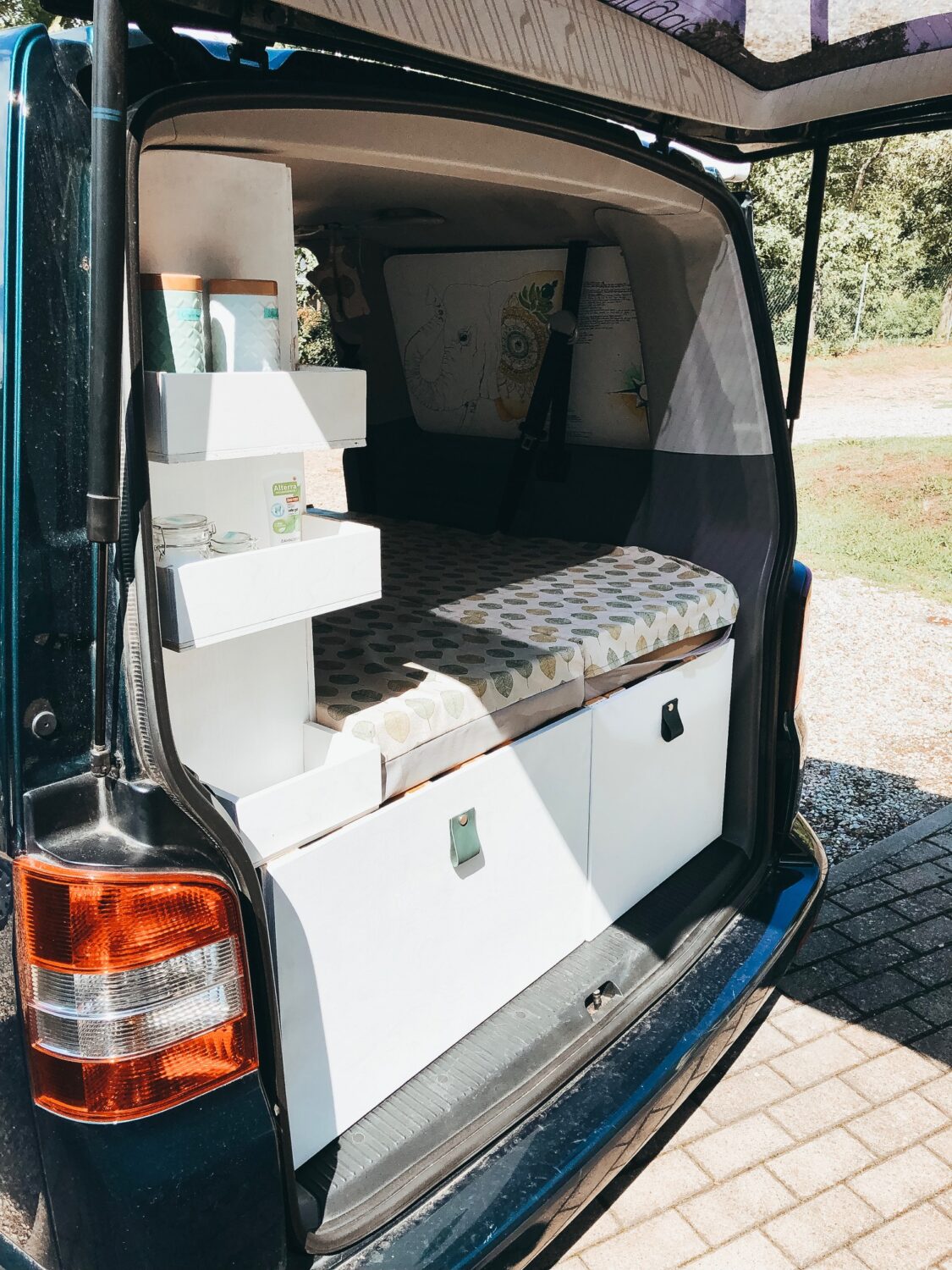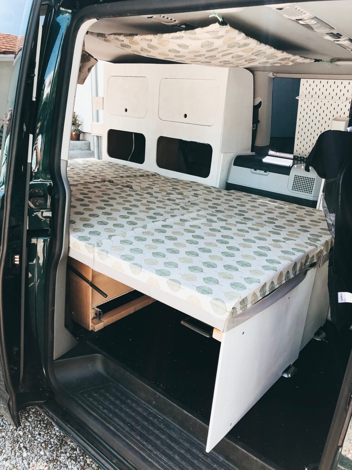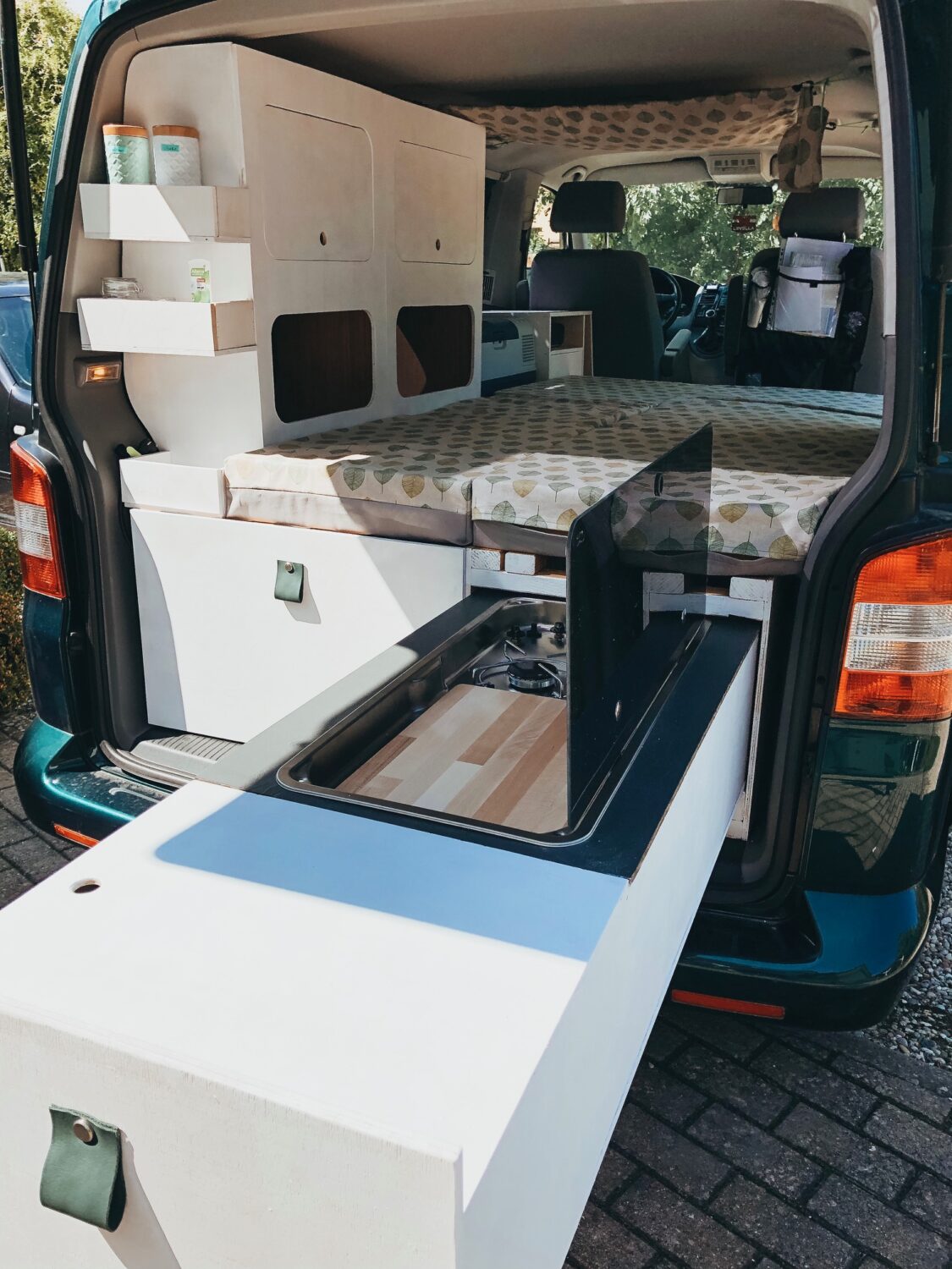 Wir haben den T5 im Dezember 2017 gekauft und haben ihn stetik aus und umgebaut. Als erstes haben wir nur ein spartanisches Bett und Miniküche eingebaut, um herauszufinden was uns im Urlaub und auf den Reisen wichtig ist und welche Ansprüche wir an unseren Campervan haben. Danach folgte 2019 ein größerer Ausbau. Wir haben uns dabei für eine typische Grundriss Variante entschieden. Die Entscheidung fiel bei uns aber auf eine Außenküche sodass wir unter unser Bett einen 1,20m langen Auszug gebaut haben welcher alle wichtigen Utensilien dafür beinhaltet. Nach zwei Wochen Möbelbau ging es für uns auf 6 Wochen Europa-Rundreise um den Ausbau auf Herz und Nieren zu testen. Nun verbessern wir stetig unser Konzept und freuen uns immer wieder wenn wir spontan in den gepackten Van springen können, um neue Abenteuer zu erleben.