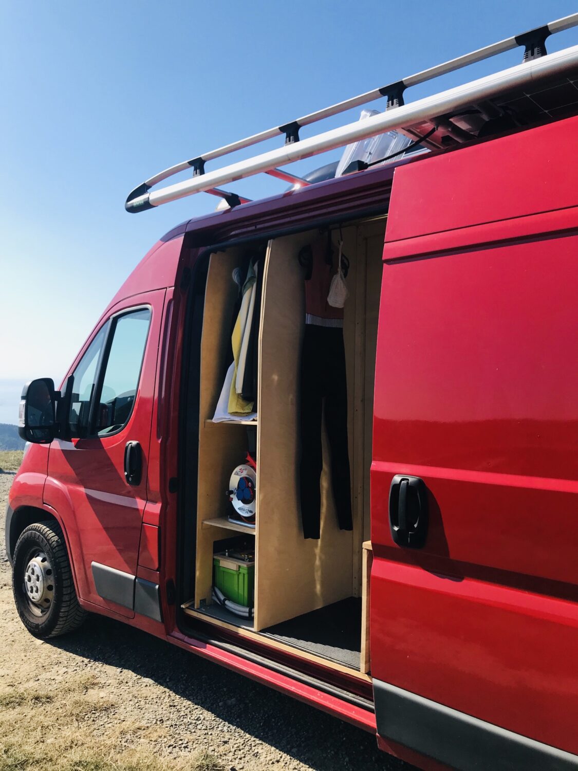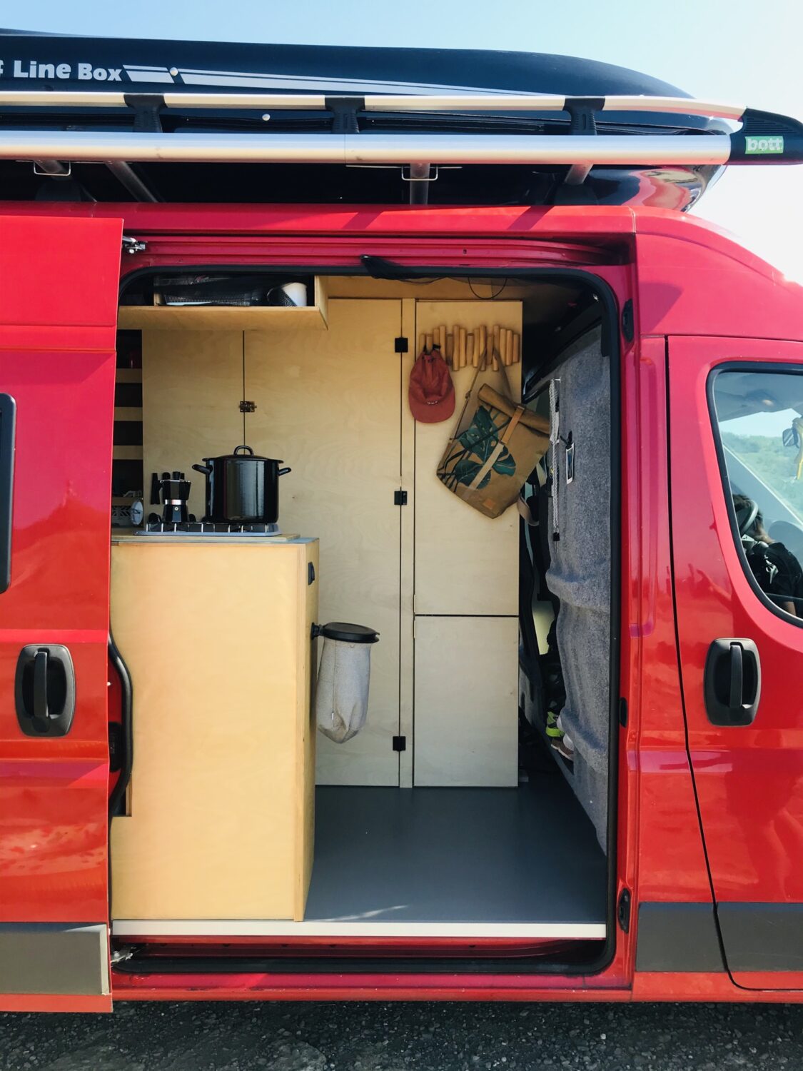 Oma hat es schon immer gesagt: Gut Ding will Weile haben... Rüdi hat gute 6 Monate gebraucht, um zu dem zu werden, der er jetzt ist! Und das reicht uns auch erstmal! Rüdis Besonderheit sind die beiden Schiebetüren. Die Eine führt direkt in den Wohnraum, die Andere gewährt den Zutritt ins Bad. Oder für uns eher der Trockenraum für nasse Neos! Wir mussten 2 Vorstellungen irgendwie versuchen zu kombinieren. Die eine Seite möchte möglichst viel Surfkram unterkriegen, die andere Seite möchte ein gemütliches Gefährt kreieren, was auch noch schön aussieht. Doch jetzt ist alles drin, was man eben so braucht und alle sind happy: Bett, umklappbar zur Sitzecke; Küchenzeile mit Gaskochfeld und kleiner Spüle; Kühlschrank über Solar; Trockenraum mit Trennklo; Kleiderschrank und Oberschränke. Wir hatten einfach Bock, coolen Schissel zu bauen! Deshalb brauchen wir über die Kosten auch gar nicht reden. N Schnapper wars nicht. Aber geil! Also: Hier kommt Rüdi!