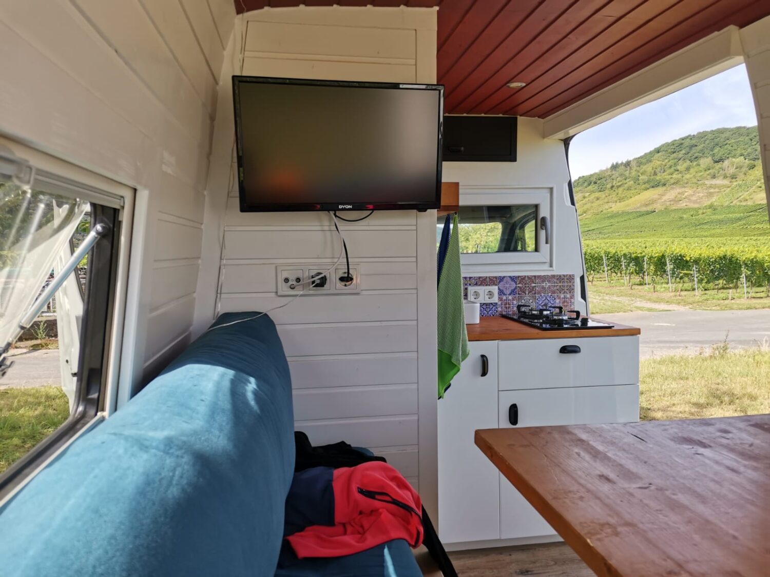 Ausbaudauer: 11.2019-02.2010 (Teilzeit) Features: 230V Stromversorgung via 400 Wp Photovoltaik und 2 kWh LiFePO4-Batterie Küchenzeile mit Waschbecken, Gasplatte und Kühlschrank 2 kW Klimaanlage/Wärmepumpe zum Heizen und Kühlen 75L Frischwasserversorgung mit Druckwasserpumpe Ele. Warmwasserboiler 10l Nasszelle mit Dusche und WC Keramik-WC mit Spülkasten und Fäkalientank sowie Pumpe (Unterboden)