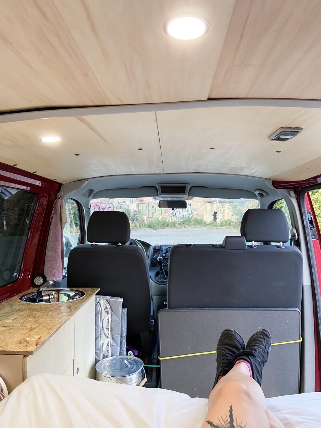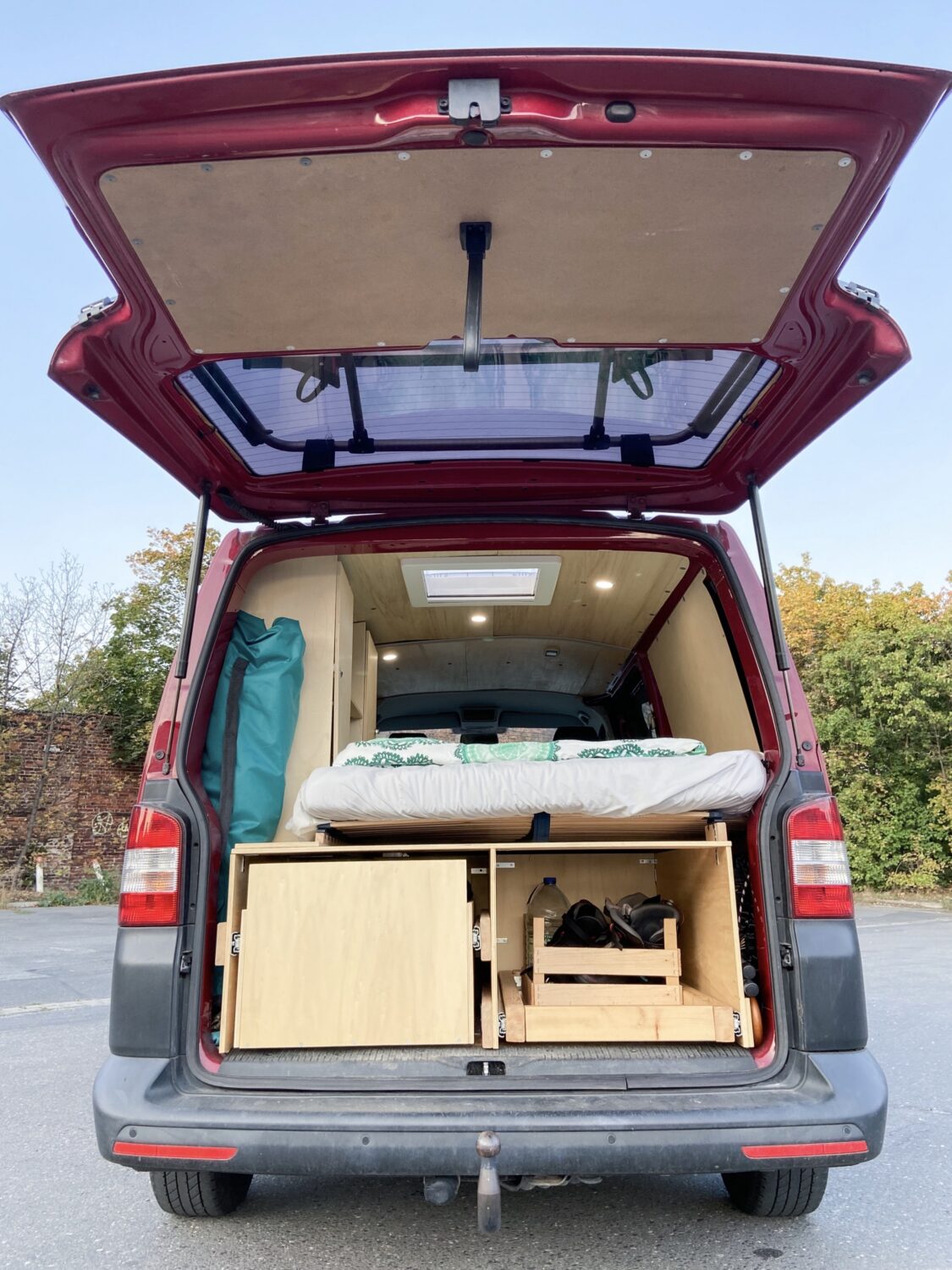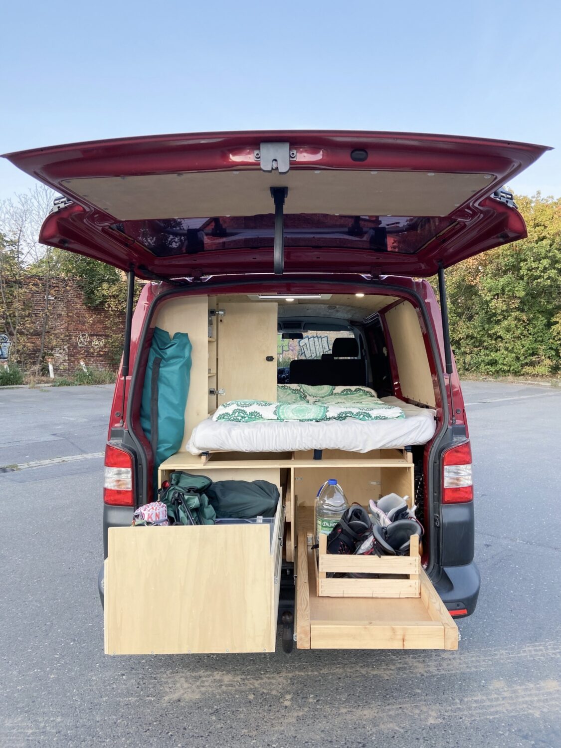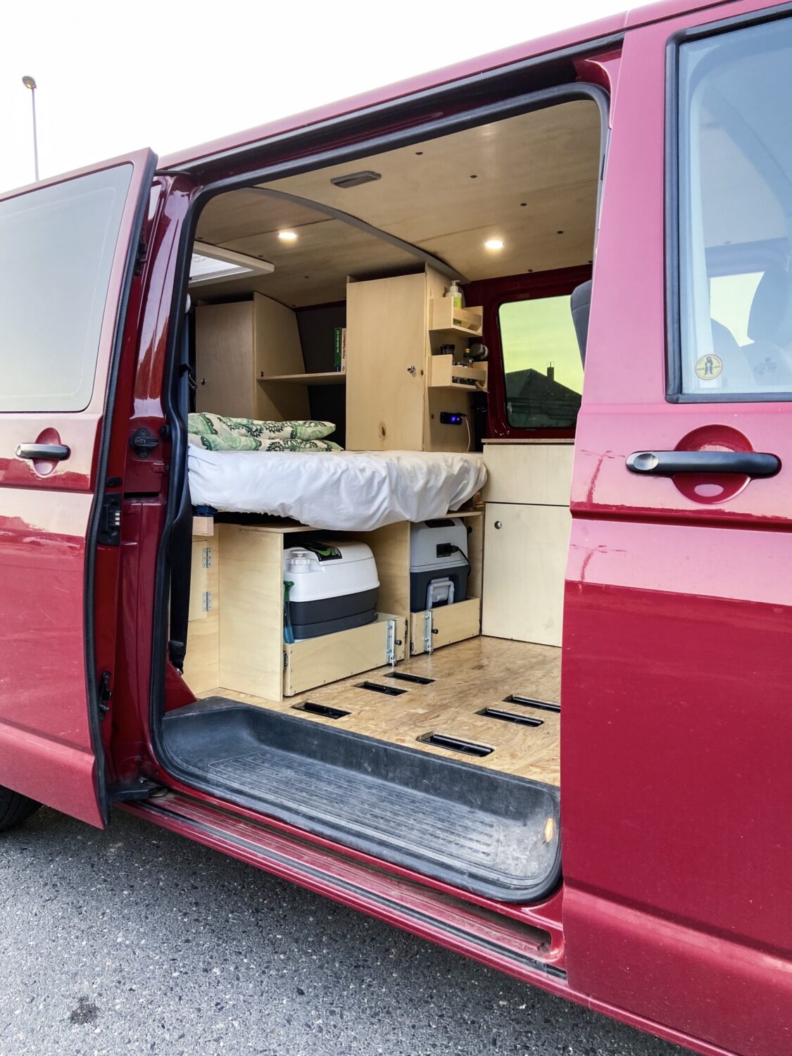 Hals über Kopf erwarben wir unseren Fuchsbau kurz vor unserer groß gefeierten Hochzeit - zum Glück, denn unsere geplanten Peru-Flitterwochen fielen ins Wasser, so mussten Trauzeuge und Ehemann eine Woche vor der Hochzeit noch "schnell" den Bus als Schritt 1 zum Campervan dämmen. Mit einem provisorischen Bau aus Resten des Bettes aus dem vorherigen Caddy und viiielen Rollkisten besuchten wir in drei Wochen dann Österreich, die Schweiz, Norditalien, Slowenien und Kroatien. In dieser Zeit wuchs die Klarheit über unsere individuellen Bedürfnisse und Anforderungen an unseren Bus. Den Winter über belasen wir uns in diversen Foren und grübelten mit Freunden, maßen die zur Verfügung stehende Fläche aus und zeichneten erste Skizzen. Um den Gefrierpunkt herum bastelten wir am neuen OSB-Fußboden, einen warmen Tag im Februar verwendeten wir für das Dachfenster. Ein Elektrotechniker zapfte unsere Starterbatterie an, wir verbauten eine 230 Ah Zweitbatterie, die nun über die liebe Sonne aufgeladen wird. Dann begann der Ausbau mit den Maßen der Kühlbox: dessen Höhe gab an, wie hoch die Unterbettkonstruktion werden konnte, inklusive einem Zentimeter Luft unter den Vollauszügen. Millimeter für Millimeter zeichnete die Frau im Haus den Bau aus Holz, der Mann durfte sägen, bohren und schrauben. Irgendwann kam der zweite Akkuschrauber dazu, Arbeitsteilung wurde zum Programm. So verbrachten wir die zweiwöchigen Osterferien komplett mit dem Innenausbau - und hatten doch erst nur die Bettkonstruktion, denn der Einbau der Vollauszüge gestaltete sich als "die müsst ihr mit SIE anreden"-Projekt. In kräftezehrender Feierabendarbeit bauten wir circa einen weiteren Monat lang unsere Kleiderschränke und die herausnehmbare Küchenzeile, denn es war uns ein Anliegen, unsere zweite Sitzreihe bei Bedarf wieder einbauen zu können. Auf das Geld wollten wir nicht schauen, denn darum geht es uns nicht - es muss uns gefallen, wir müssen uns wohlfühlen und es muss praktisch sein. Natürlich war vor jedem Baumarktbesuch ein Blick aufs Konto von Nöten - und was nicht drin war, war eben nicht in dem Moment drin. Dennoch gönnten wir uns nach und nach alles, was auch in unserem Kopf herumschwirrte. Naja, die Drehkonsole für die Beifahrersitzbank fehlt noch... Aber da sind wir uns auch noch nicht so sicher. Besonders praktisch finden wir unser "Dreckwäschefach" am rechten hinteren Radkasten. Im Vergleich zu vielen anderen Nächten auf Multiplexplatten genießen wir nun die Gemütlichkeit unserer Lattenrostkonstruktion. Nicht missen können wir unser Campingklo (haben aber schon eine Trenntoilette im Blick, das wird wohl unser Winterbauprojekt) und unser Waschbecken. Wir legen sehr großen Wert darauf, absolut nichts an unseren Stellplätzen zu hinterlassen, auch keine Pippigerüche oder Häufchen. Wir waschen uns meist "katzenwäschenmäßig" mit Waschlappen und Seife am Waschbecken - haben aber auch eine Pumpdusche. Stolz sind wir auf alles! Darauf, dass wir es angepackt haben, dass wir unseren Traum verwirklicht haben, dass wir alles aus unserer Kraft heraus schafften. Dass wir uns so unglaublich viel Wissen angeeignet haben, Fähigkeiten, die wir vorher nicht besassen oder die nur in Anfängen steckten. Zu Beginn hab ich über die Sägeanfänge meines Mannes abgekotzt, der die Sitzhalterungsaussparungen unglaublich...grob in die OSB-Platten gefetzt hat. Mittlerweile bin ich stolz darauf, darin die Anfänge zu sehen - und in den perfekten Rundungen des Dachhimmels die Perfektion seiner Sägekompetenz. Wir lieben uns, wir lieben unseren Fuchsbau, und wir lieben es, damit unterwegs zu sein.