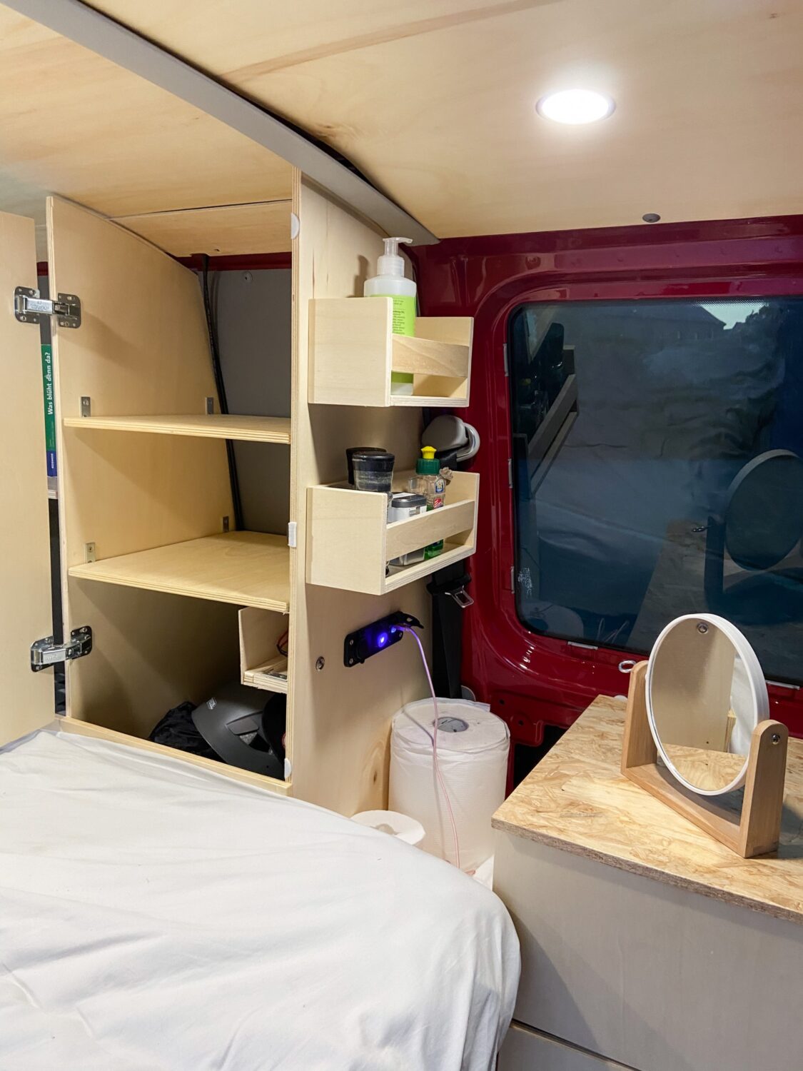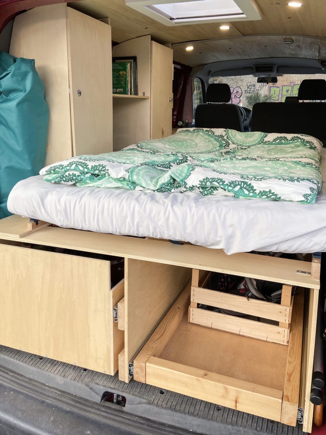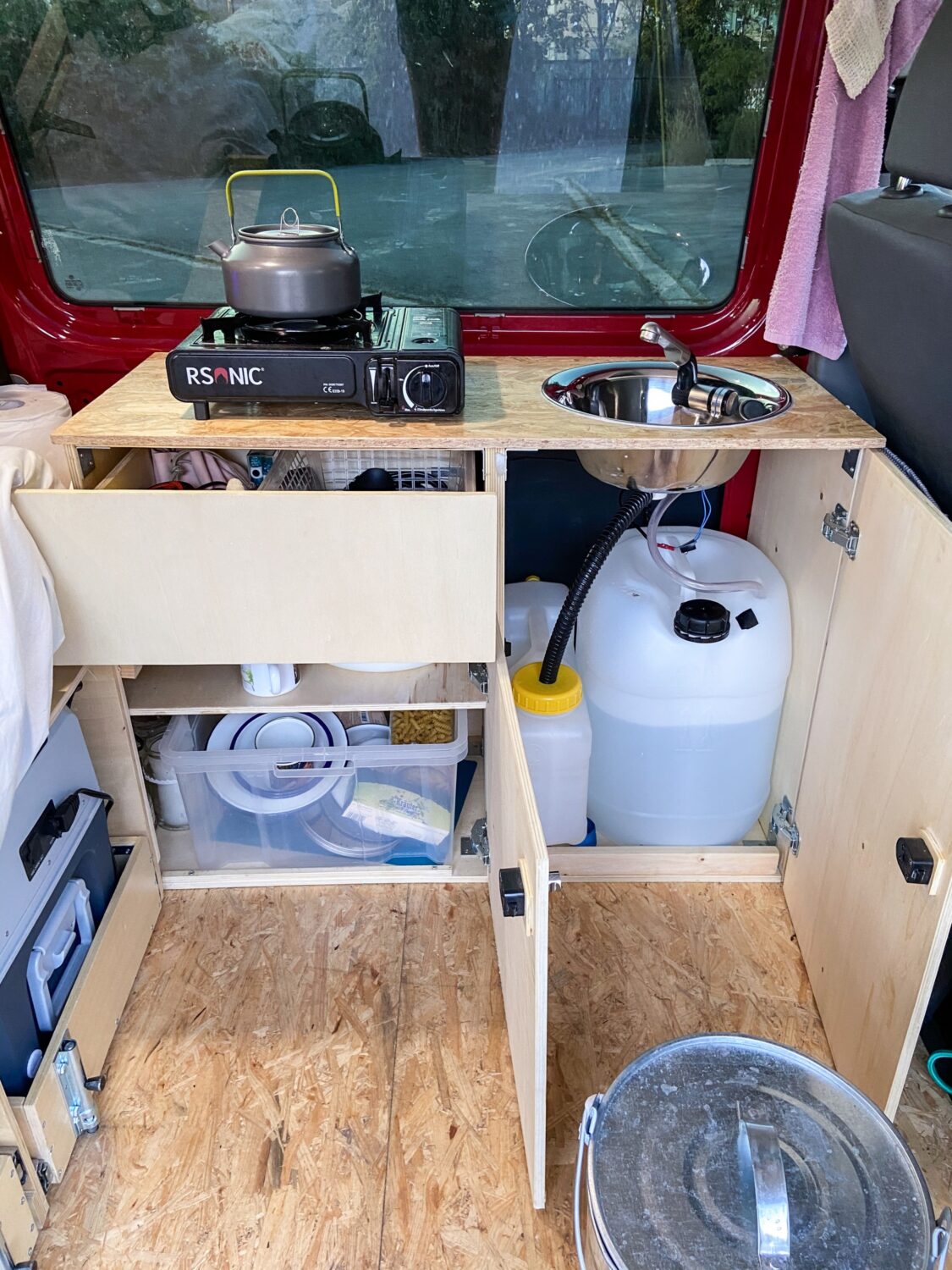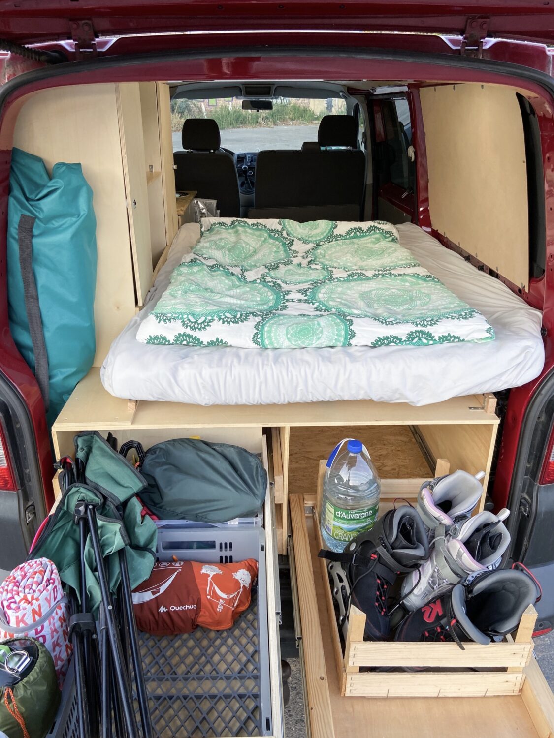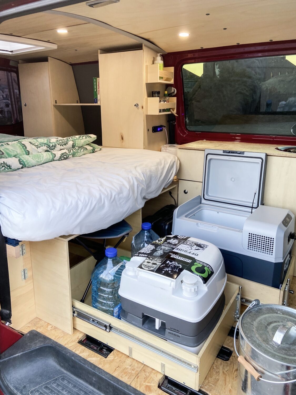 Hals über Kopf erwarben wir unseren Fuchsbau kurz vor unserer groß gefeierten Hochzeit - zum Glück, denn unsere geplanten Peru-Flitterwochen fielen ins Wasser, so mussten Trauzeuge und Ehemann eine Woche vor der Hochzeit noch "schnell" den Bus als Schritt 1 zum Campervan dämmen. Mit einem provisorischen Bau aus Resten des Bettes aus dem vorherigen Caddy und viiielen Rollkisten besuchten wir in drei Wochen dann Österreich, die Schweiz, Norditalien, Slowenien und Kroatien. In dieser Zeit wuchs die Klarheit über unsere individuellen Bedürfnisse und Anforderungen an unseren Bus. Den Winter über belasen wir uns in diversen Foren und grübelten mit Freunden, maßen die zur Verfügung stehende Fläche aus und zeichneten erste Skizzen. Um den Gefrierpunkt herum bastelten wir am neuen OSB-Fußboden, einen warmen Tag im Februar verwendeten wir für das Dachfenster. Ein Elektrotechniker zapfte unsere Starterbatterie an, wir verbauten eine 230 Ah Zweitbatterie, die nun über die liebe Sonne aufgeladen wird. Dann begann der Ausbau mit den Maßen der Kühlbox: dessen Höhe gab an, wie hoch die Unterbettkonstruktion werden konnte, inklusive einem Zentimeter Luft unter den Vollauszügen. Millimeter für Millimeter zeichnete die Frau im Haus den Bau aus Holz, der Mann durfte sägen, bohren und schrauben. Irgendwann kam der zweite Akkuschrauber dazu, Arbeitsteilung wurde zum Programm. So verbrachten wir die zweiwöchigen Osterferien komplett mit dem Innenausbau - und hatten doch erst nur die Bettkonstruktion, denn der Einbau der Vollauszüge gestaltete sich als "die müsst ihr mit SIE anreden"-Projekt. In kräftezehrender Feierabendarbeit bauten wir circa einen weiteren Monat lang unsere Kleiderschränke und die herausnehmbare Küchenzeile, denn es war uns ein Anliegen, unsere zweite Sitzreihe bei Bedarf wieder einbauen zu können. Auf das Geld wollten wir nicht schauen, denn darum geht es uns nicht - es muss uns gefallen, wir müssen uns wohlfühlen und es muss praktisch sein. Natürlich war vor jedem Baumarktbesuch ein Blick aufs Konto von Nöten - und was nicht drin war, war eben nicht in dem Moment drin. Dennoch gönnten wir uns nach und nach alles, was auch in unserem Kopf herumschwirrte. Naja, die Drehkonsole für die Beifahrersitzbank fehlt noch... Aber da sind wir uns auch noch nicht so sicher. Besonders praktisch finden wir unser "Dreckwäschefach" am rechten hinteren Radkasten. Im Vergleich zu vielen anderen Nächten auf Multiplexplatten genießen wir nun die Gemütlichkeit unserer Lattenrostkonstruktion. Nicht missen können wir unser Campingklo (haben aber schon eine Trenntoilette im Blick, das wird wohl unser Winterbauprojekt) und unser Waschbecken. Wir legen sehr großen Wert darauf, absolut nichts an unseren Stellplätzen zu hinterlassen, auch keine Pippigerüche oder Häufchen. Wir waschen uns meist "katzenwäschenmäßig" mit Waschlappen und Seife am Waschbecken - haben aber auch eine Pumpdusche. Stolz sind wir auf alles! Darauf, dass wir es angepackt haben, dass wir unseren Traum verwirklicht haben, dass wir alles aus unserer Kraft heraus schafften. Dass wir uns so unglaublich viel Wissen angeeignet haben, Fähigkeiten, die wir vorher nicht besassen oder die nur in Anfängen steckten. Zu Beginn hab ich über die Sägeanfänge meines Mannes abgekotzt, der die Sitzhalterungsaussparungen unglaublich...grob in die OSB-Platten gefetzt hat. Mittlerweile bin ich stolz darauf, darin die Anfänge zu sehen - und in den perfekten Rundungen des Dachhimmels die Perfektion seiner Sägekompetenz. Wir lieben uns, wir lieben unseren Fuchsbau, und wir lieben es, damit unterwegs zu sein.