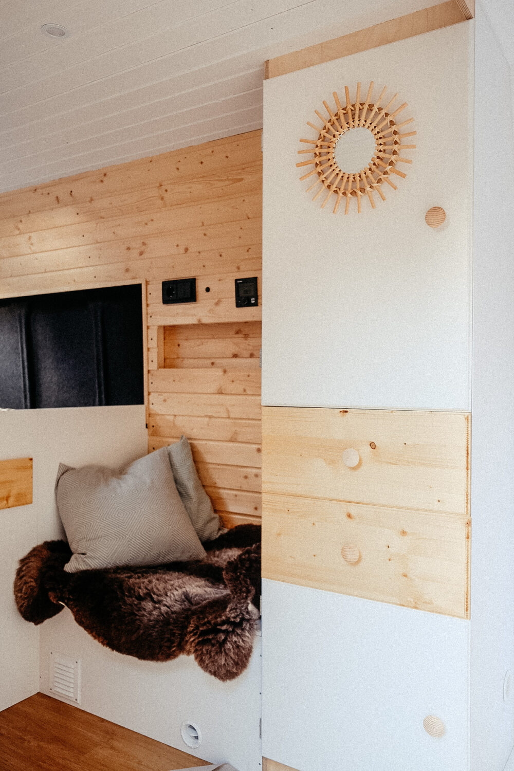 Wir haben effektiv etwa 6-7 Monate gebaut. Den Van haben wir bereits 2019 gekauft, wir haben aber zwischendurch eine Winter- und eine Babypause eingelegt. Uns war es wichtig autark stehen zu können und den Ausbau mit hochwertigen Produkten auszuführen, so dass dieser hoffentlich sehr langlebig sein wird. Auf dem Dach findet ihr bei uns zwei Solarpanele mit jeweils 180 Watt. Zusätzlich haben wir die Möglichkeit unsere Zustazbatterie über Landstrom und die Lichtmaschine zu laden. Im Innenraum werden eigentlich keine Wünsche offen gelassen. Unser Bett ist fest verbaut und bietet eine Liegefläche von 1,40m x fast 2m. Zusätzlich gibt es eine Sitzecke mit ausziehbarem Tisch, Hochschränke und einen relativ großen Kleider- und Küchenschrank. Unsere Küchenzeile ist sehr schmal, aber dafür mit einem festen Gaskochfeld und einem Waschbecken ausgestattet. In der Heckgarage befinden sich zwei Gasflaschen mit jweils 11kg, die neben der Küche auch unsere Standheizung mit integriertem Warmwasserboiler versorgt. Ebenfalls in der Garage ist ein Frischwassertank mit knapp 100 Litern Fassungsvermögen verbaut, der dazugehörige Abwassertank ist unterm Auto verbaut. Auf ein kleines Badezimmer haben wir auch nicht verzichtet und können im Camper duschen und unsere Trockentrenntoilette nutzen.