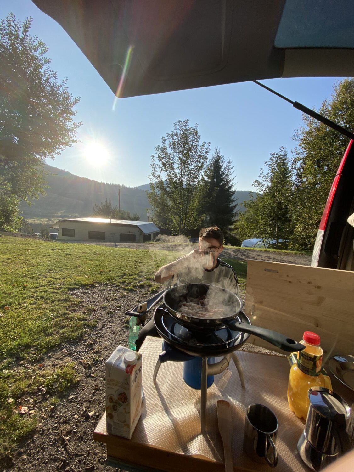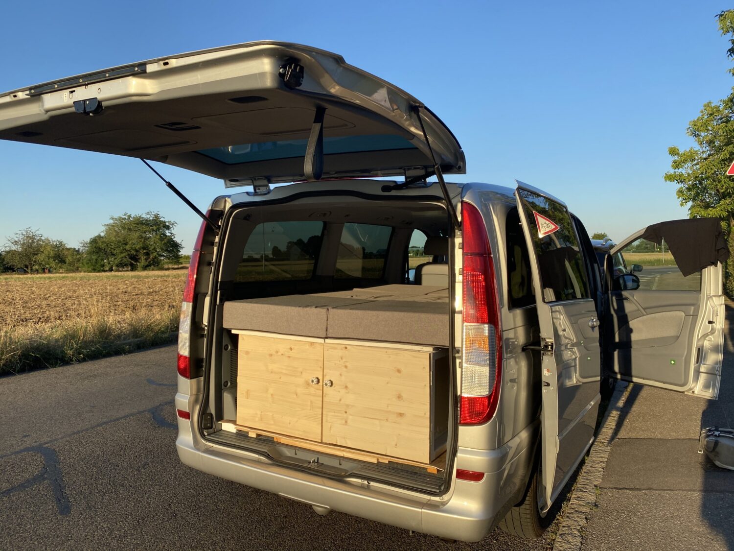 Der Ausbau war innerhalb von 2 Wochen, jeweils an den Wochenenden, fertig - da wir einen regulären minivan (PKW) und kein Nutzfahrzeug haben, haben wir nichts rausgerissen, sondern nur ein Untergestell mit Bett, Tisch und Stauraum mit Bodenplatte verbaut. Wir hatten beide vorher noch nie etwas mit Handwerk am Hut - daher sind wir super stolz auf unseren kleinen Camper, auch wenn es hier einige Kracher gibt und unserer nicht mal ansatzweise heraussticht 😄