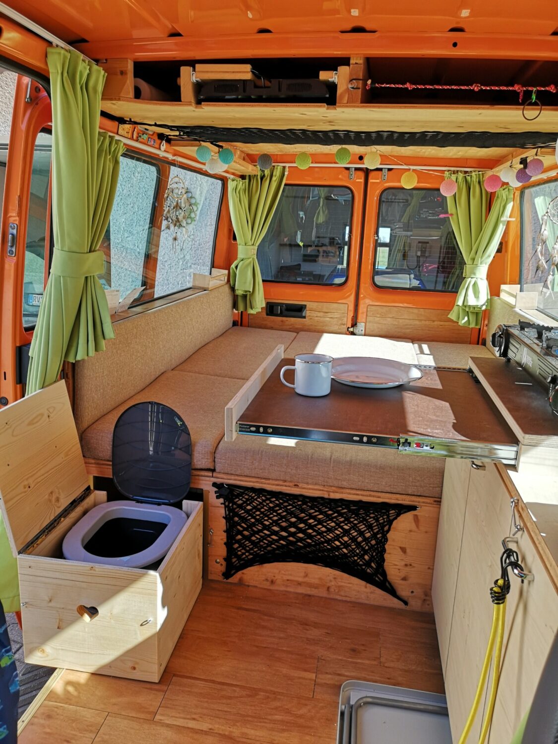 Ich habe eine 8l Solardusche und einen Eimertoilette.