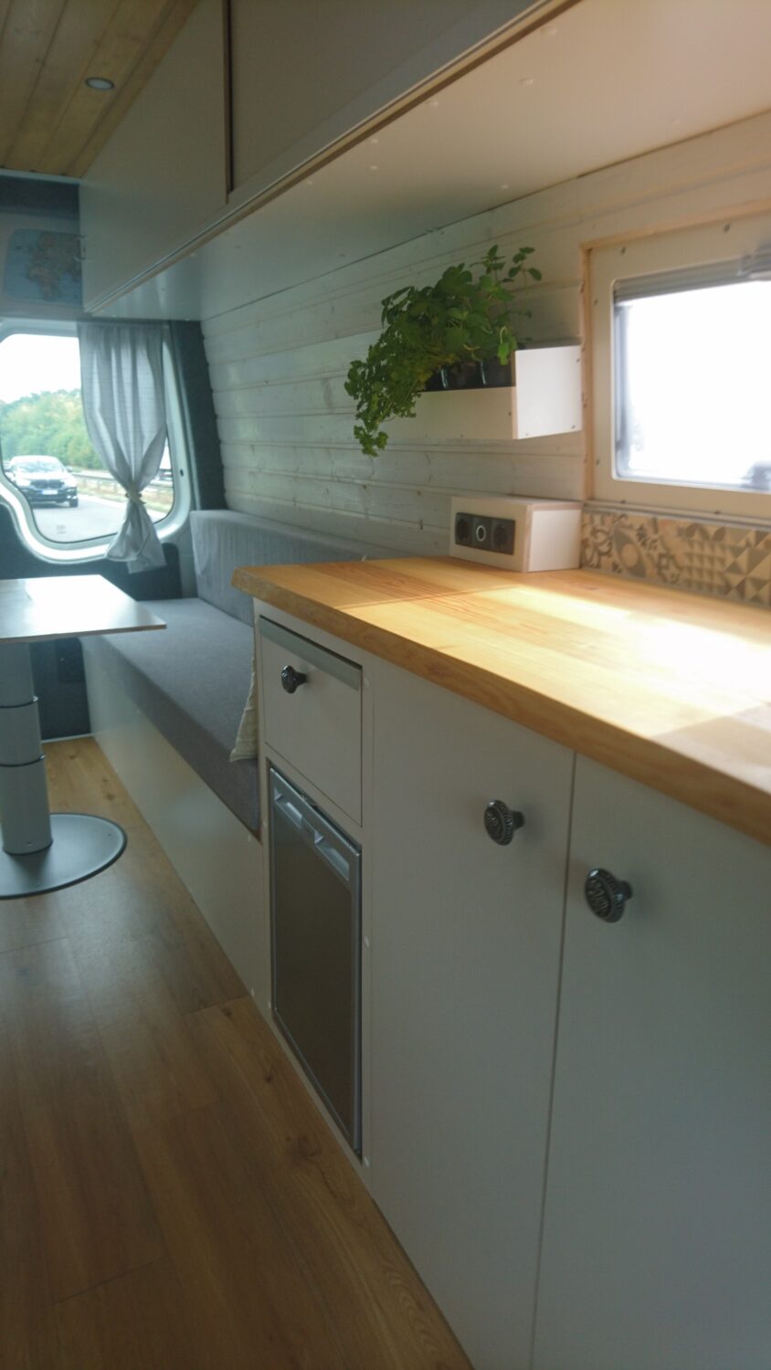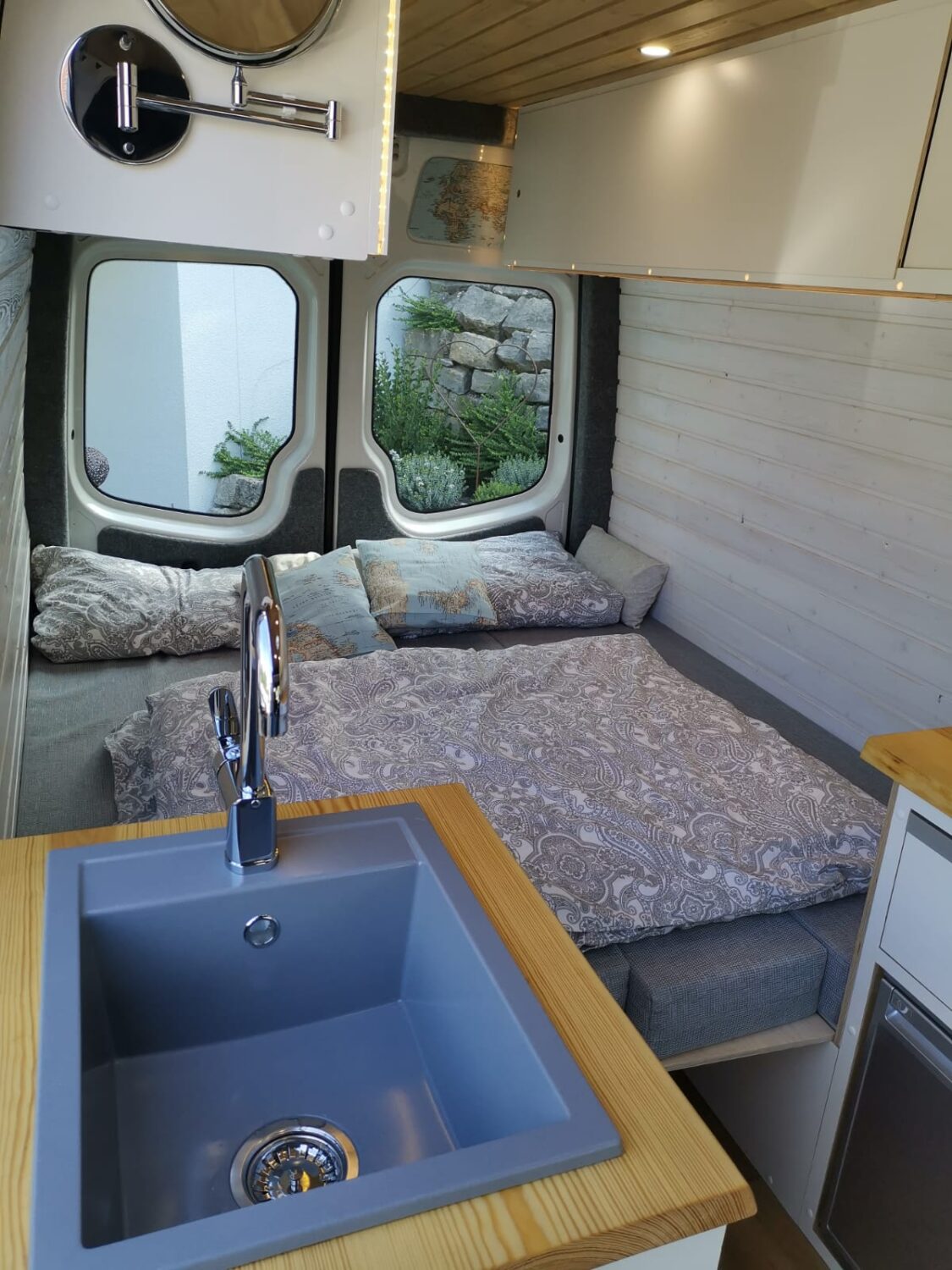 Herzlich willkommen auf unserem Profil, schön dass ihr zu Uns gefunden habt. Unser Ausbau hat mit kurzer Corona Unterbrechung ca. 6 Monate gedauert. Bevor unser Jimmedy zum Wohnmobil wurde, diente er einem KFZ-Händler als Werkstattwagen. Dementsprechend war er zwar komplett leer, aber in technisch guten Zustand. Auch mit Rost haben wir bis heute wenig Probleme. Unser Camper hat in Eigenregie folgende Ausstattung erhalten: - Isolierung (Armaflex) inkl. Dampfsperre - Solaranlage, zwei Zusatzbatterien mit jeweils 95AH, 1000W Wandler - 60 Liter Kompressor-Kühlschrank inkl. Kühlfach - Granit-Waschbecken in hausüblicher Größe - 70 Liter Frischwassertank und 30 Liter Abwasserkanister - Drehkonsole für den Beifahrersitz - Rückfahrkamera, verbunden mit einem neuen Radio - Ausstellfenster seitlich und Dachluke inkl. Ventilator - 2KW Diesel-Luft-Standheizung von Autotherm - LED-Deckenspots, 230V Steckdosen - Verkleidung diverser Teile mit Filz - Echtholz Arbeitsplatten, Möbel aus Birke-Multiplex