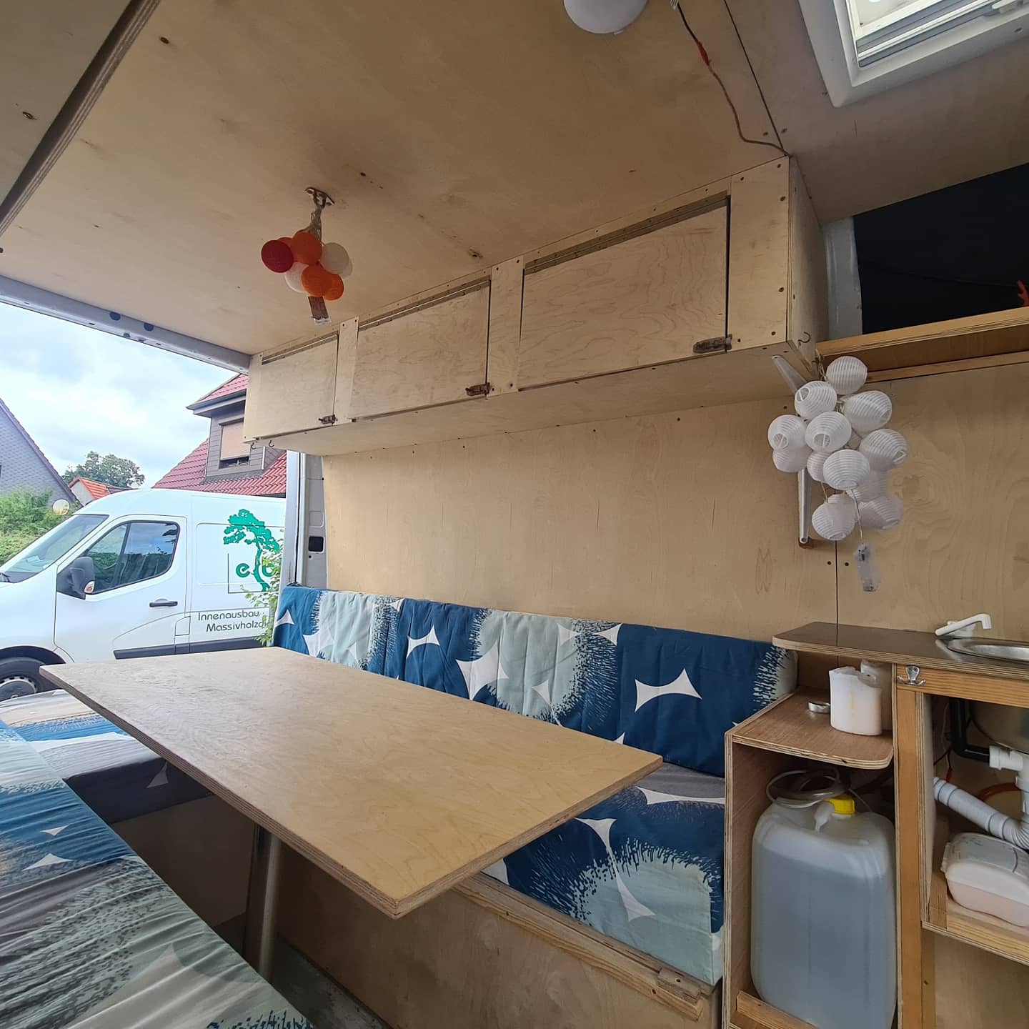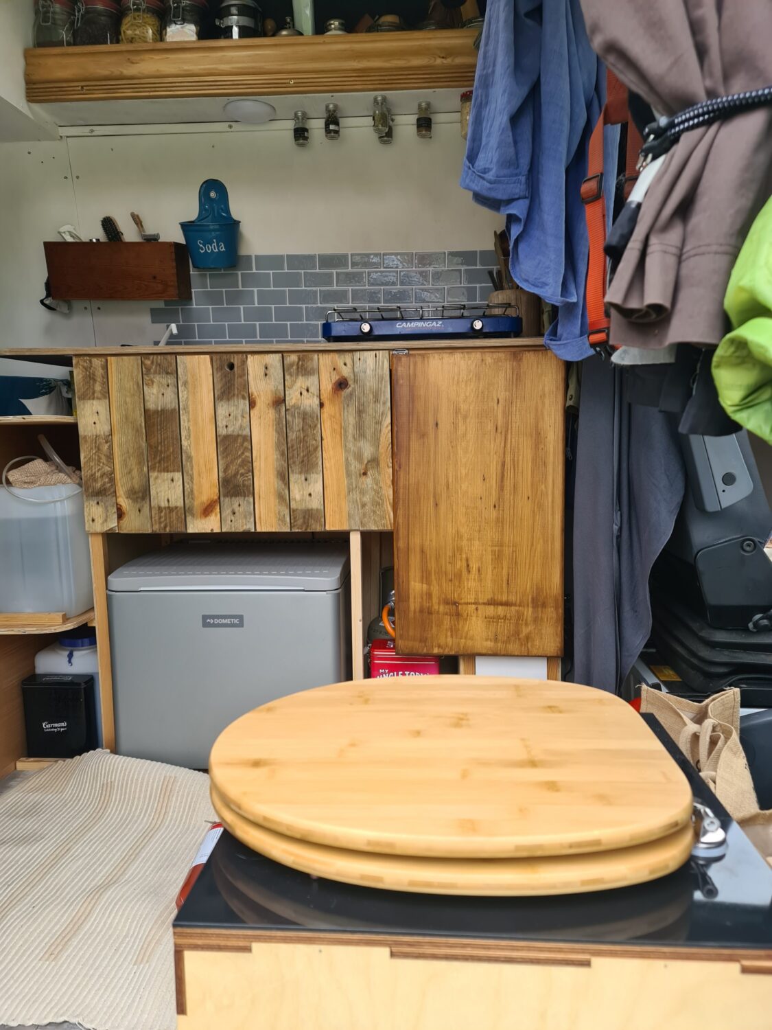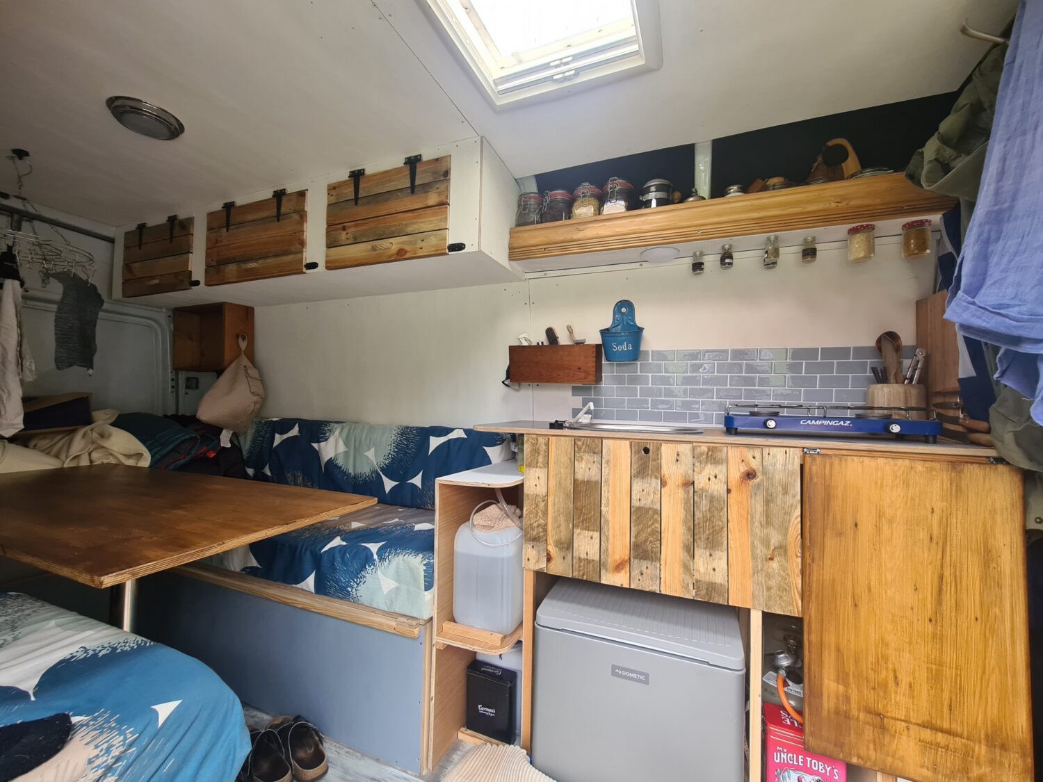 Wir haben den Van erst vor einparken Wochen gekauft. Und dann innen gestrichen und Türen aus Einwegpaletten gebaut. Wir sind Stolz auf upcycling und Minimalismus. Um das Trennklo unterzubringen, haben wir die Kühlbox auf einen Auszug gestellt.