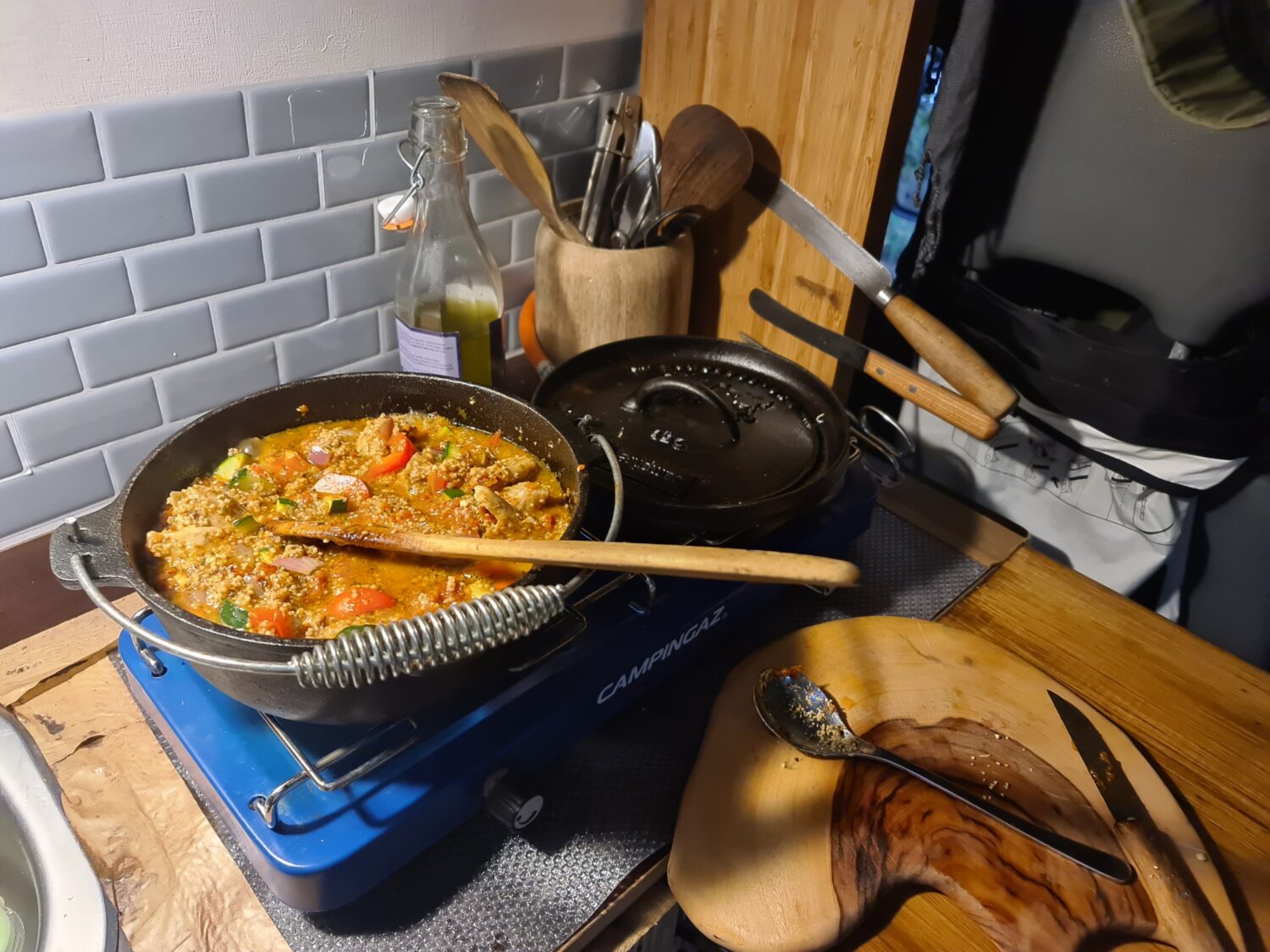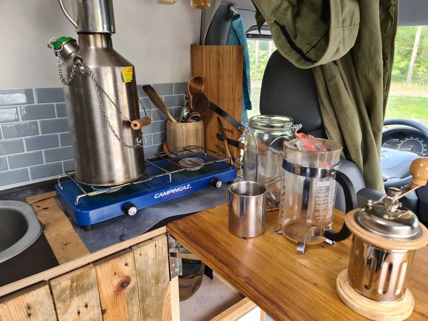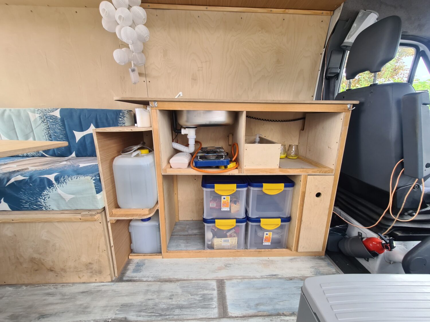 Wir haben den Van erst vor einparken Wochen gekauft. Und dann innen gestrichen und Türen aus Einwegpaletten gebaut. Wir sind Stolz auf upcycling und Minimalismus. Um das Trennklo unterzubringen, haben wir die Kühlbox auf einen Auszug gestellt.