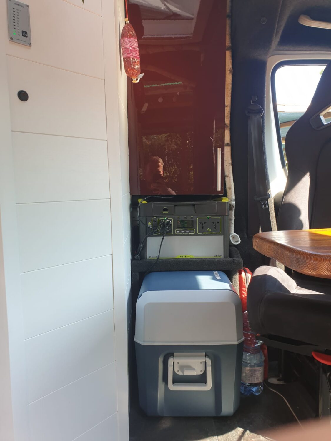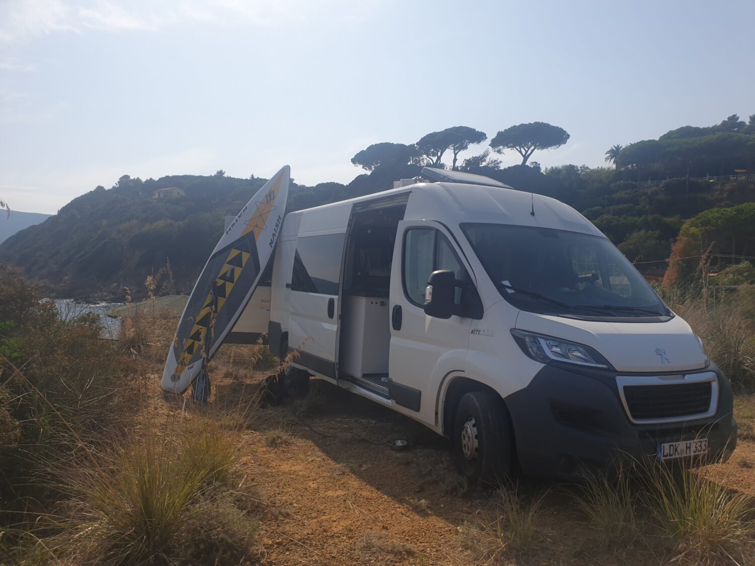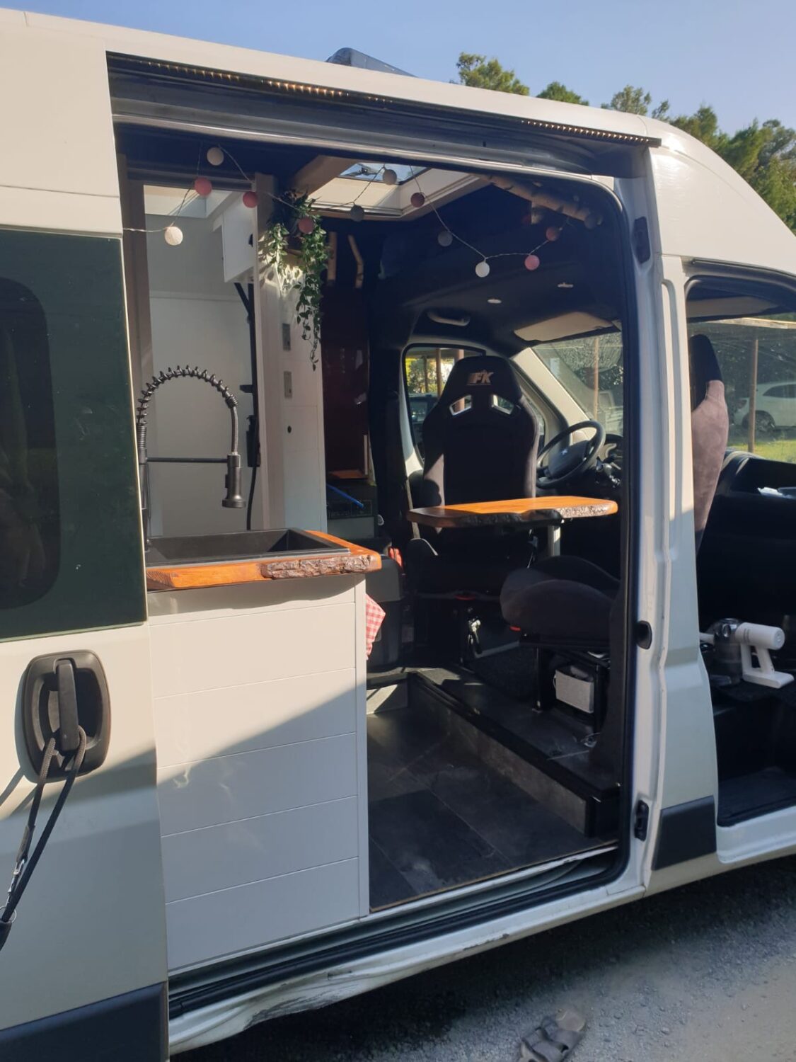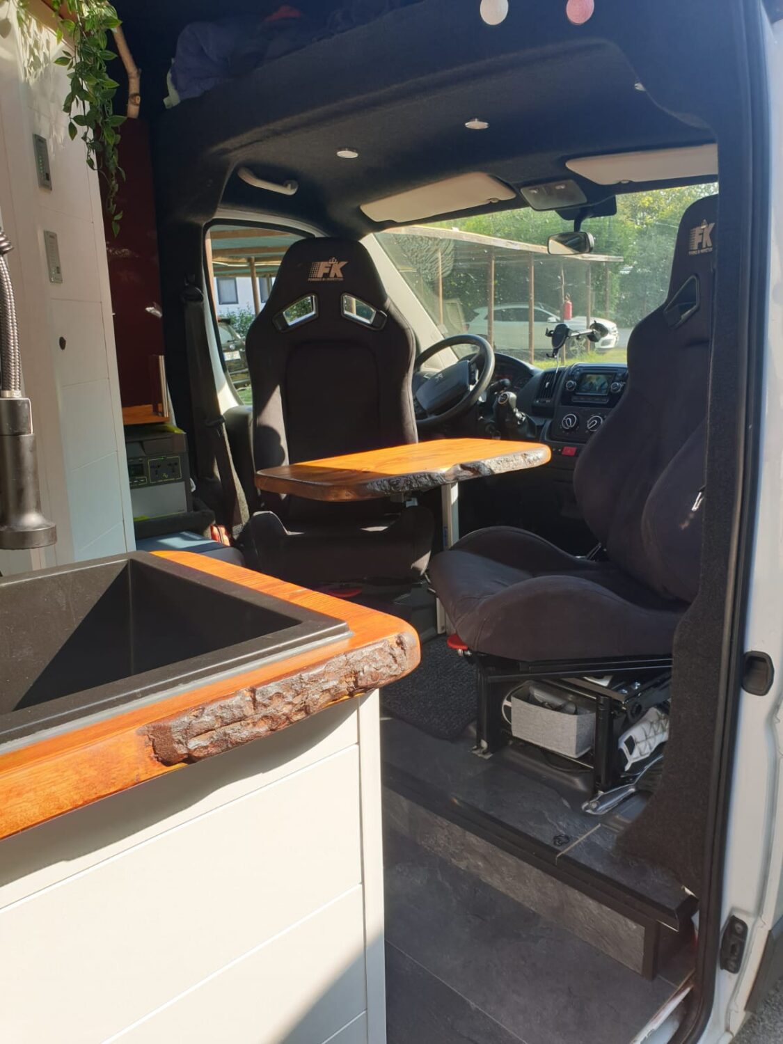 Wir stellen unseren Peugeot Boxer 2.3 TDI mit 153 PS zum Camperausbau vor :) Der Kastenwagen wurde leer als Transporter gekauft und anschließend komplett umgebaut. Als Transporter wurde er genutzt um Rollstühle und Krankenbetten zu transportieren. Somit wurde er nie überladen gefahren oder zugemüllt. Nach dem entkernen, wurde das Fahrzeug von uns im Inneren komplett gereinigt und versiegelt. Als nächstes wurden drei Dachfenster. Danach haben wir den Camper verkabelt und mit 230 Volt und 12 Volt Steckdosen, an den gewünschten Stellen bestückt. Die Stromquelle ist ein Goal Zero Yeti 1400, welcher 1500 Watt Dauerstrom und 3000 Watt Anlaufstrom mit einer Kapazität von 1400 Watt/h leistet. Der Yeti kann über die montierte Landstromsteckdose, sowie über einen montierten Spannungswandler geladen werden. Das Laden über Solar ist grundsätzlich möglich, jedoch noch nicht montiert. Grund hierfür war, dass wir nie länger als 2-3 Tage an einem Platz standen und den Yeti somit während der Fahrt laden konnten. Wir nutzen einen Kaffevollautomat, zwei Kompressorkühlboxen, einen Fön, sowie Stabmixer, Handylader, Licht usw. und kommen mit der genannten Kapazität 3-4 Tage, ohne Nachzuladen, aus. Das Wassersystem für Dusche, Spülbecken und Außenwasseranschluss wird über eine Druckwasserpumpe, die 7,5 Liter Wasser/Minute liefert, betrieben. Verbaut ist ein 120 Liter Frischwassertank. In der 80x60cm großen Dusche, ist eine Trockentrenntoilette verbaut, die sich auf Knopfdruck in die Dusche fahren lässt. Somit hat man die komplette Nasszelle zum duschen, wenn die Toilette nicht benötigt wird. In der Dusche befindet sich ein 50x70cm großes Dachfenster, welches eine Stehhöhe von über 2 Meter und ausreichend Tageslicht gewährleistet. Die Nasszelle kann über eine Schiebetür verschlossen werden. Das festverbaute Bett hat eine Größe von ca. 195 x 140cm. Über dem Bett ist ein Dachfenster mit integriertem Ventilator verbaut. Das Fenster kann bei Regen geöffnet bleiben und durch einen Verdunklungsrollo verdunkelt werden. Es findet sich dort ein Bedienfeld wieder, welches auch durch eine Fernbedienung bequem zu bedienen ist. Über dem Bett befinden sich zwei Hängeschränke. Diese nutzten wir als Kleiderschrank und kamen mit dem Platz sehr gut aus. Die Küche besteht aus zwei Unterschränken mit den dazugehörigen Türen. Unter dem Bett befindet sich ein Schrank mit 3 Schubladen. Diese verschwinden unter dem Bett und lassen sich passgenau in die Küche ausziehen. In der Arbeitsplatte befindet sich ein Spülbecken mit schwenkbarem Wasserhahn und einer versenkbaren 3er Steckdose (230 Volt). Über der Arbeitsfläche ist eine weitere kleine Ablage montiert, an der ein LED-Band in einem Aluminiumprofil mit Milchglas befestigt ist. Dieses lässt sich mit Farbwechsel über eine Fernbedienung bedienen. Gleiches gilt für eine Ablage über dem Kopfteil im Bett. Zwischen der Nasszelle und dem Fahrersitz befindet sich die Yeti, sowie ein Stromschrank, indem die einzelnen 12v Stromkreise abgesichert wurden. Über der Fahrerkabine befindet sich eine ausreichend große Ablage, in der wir Handtücher, die Verdunkelung für Front- und Seitenfenster, und vieles mehr verstaut haben. Das Fahrzeug wurde mit drei Sitzen (ein Fahrersitz und Beifahrer-Doppelsitzbank) gekauft. Diese haben wir durch zwei Sportsitze ersetzt, die jeweils zusätzlich eine Drehkonsole besitzen. Somit lassen sich die Sitze bequem drehen und mit einem schwenkbaren Tisch erweitern. Unter dem Bett findet sich ein sehr großer Stauraum wieder, der durch die beiden Hecktüren zugänglich ist. Hier lässt sich der Frischwassertank befüllen. Zusätzlich gibt es hier einen Anschluss für unsere Außendusche sowie eine weitere 230V Steckdose. Eine Anhängerkupplung welche 2,5 Tonnen ziehen darf haben wir nachträglich ergänzt. Zu guter Letzt, damit der Boxer auch im Winter das Campen erlaubt, haben wir eine 4kw Diesel- Standheizung verbaut, die über ein Bedienelement für warme Luft im Innenraum, sowie über einen Warmwasserboiler für warmes Wasser in der Dusche und Spüle sorgt. Der Boiler kann das Wasser alternativ über 230Volt erwärmen.