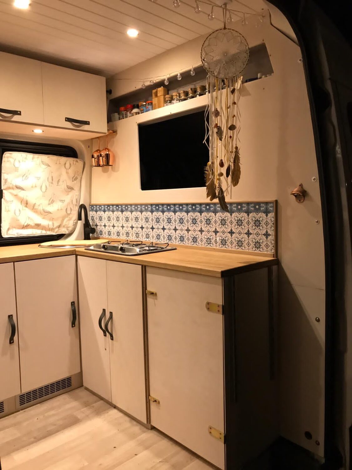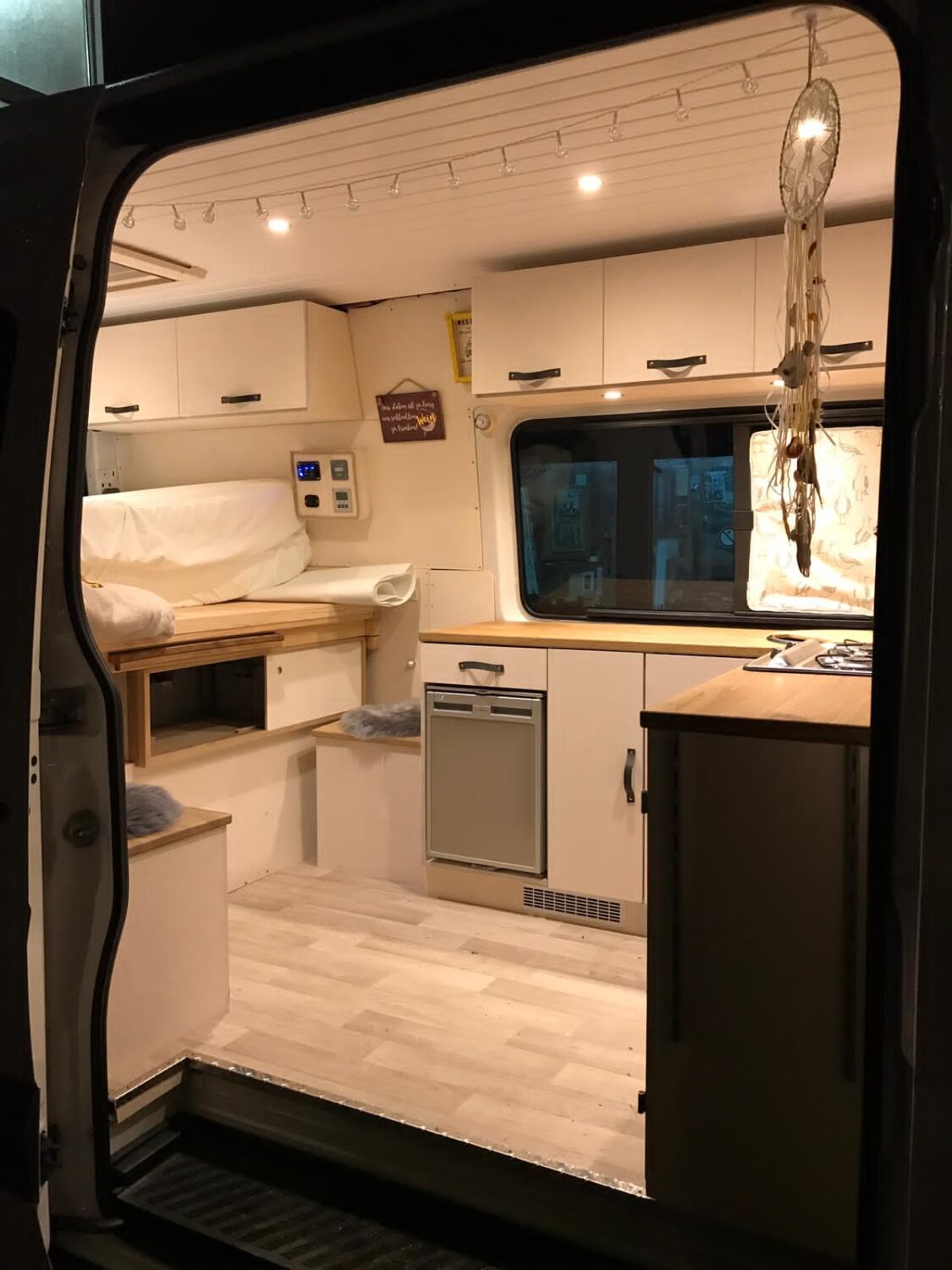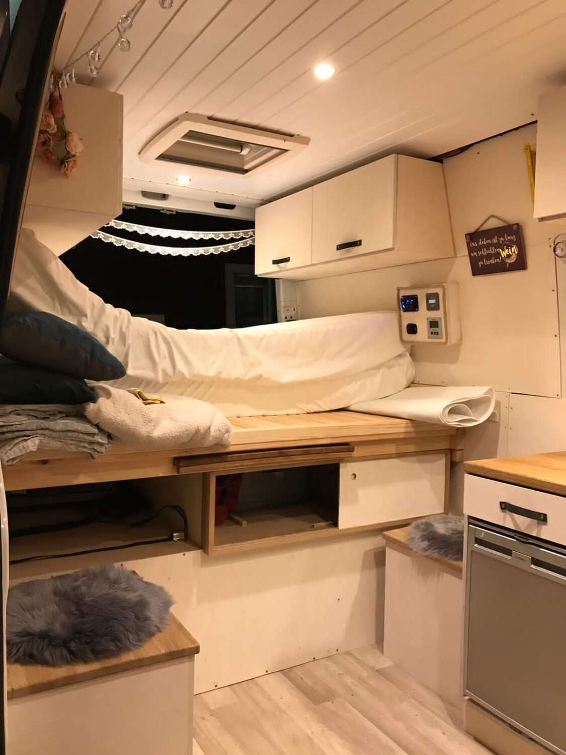 Wir konnten Rainer in 31 Tagen komplett um- bzw. ausbauen. Er hat 109 PS und läuft mit der 2.0 L Diesel Maschine. Verklebt sind Alubutyl und Armaflex als Grundlage/Dämmung. Verbaut wurden 37,5 qm Multiplex Birke in 15 und 6 mm Stärke. Der gesamte Innenausbau ist eine individuelle Anfertigung in Zusammenarbeit mit seinem Namensgeber (Tischler mit großer Werkstatt). Unser Bett und unsere Arbeitsplatte wurden aus Kiefern- bzw. Eichenbohlen gefertigt. Lasiert mit kalkweißer Farbe. Die Decke besteht aus 18 lfm Profex-Kunststoffpaneelen. Spart ordentlich Gewicht! Zusätzlich haben wir eine 278 Ah AGM-Versorgerbatterie verbaut. Diese bekommt Strom von der Offgridtec-Solaranlage mit Regler von Votronic. Insgesamt 220 W aus 2 Modulen. Den Rest regelt das BMS von Victron Energy. Einen Wechselrichter mit 600 W gibt es auch! Basis sind aber 12 V. Ein 2-flammiger Gasherd sorgt für warmes Essen und ein 84 L Tank für ausreichend Trinken und Nudelwasser. Neben ordentlich Stauraum haben wir eine Surfboard-Garage unter dem Bett, um unsere Boards mitnehmen zu können. Eine Dusche gibt es in Form einer Tauchpumpe und eines Eimers. Die Gastherme ist leider beim 1. Test abgebrannt. Eine Toilette haben wir nicht dabei, dafür aber einen Klappspaten!