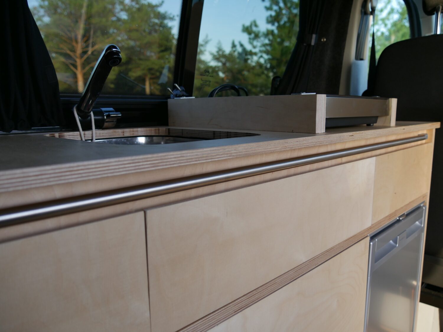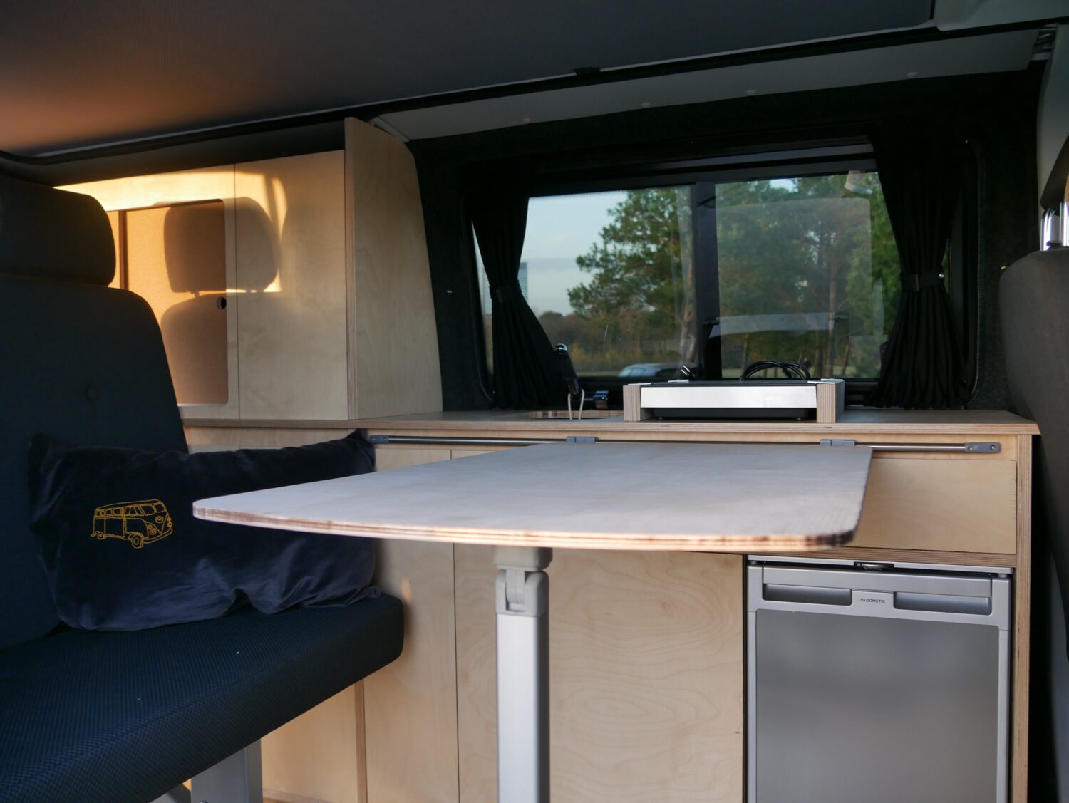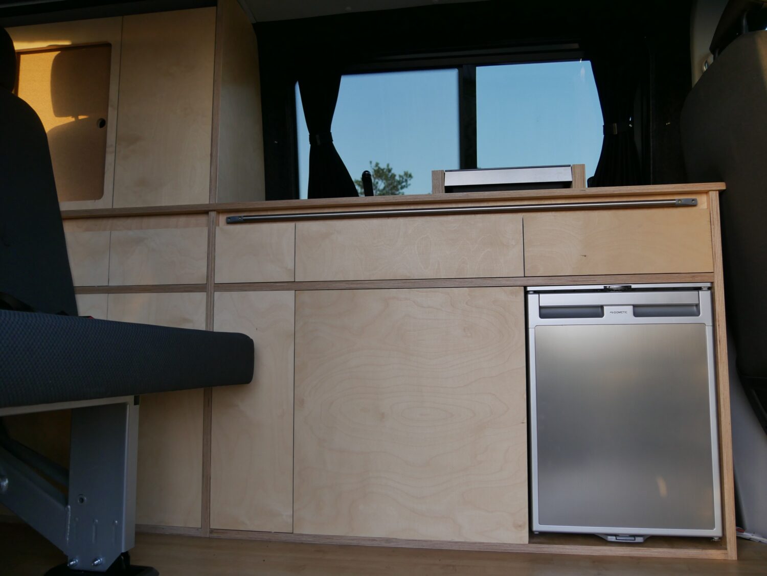Der Ausbau hat ca. 1 1/2 Jahre gedauert. Bis auf die Sitzbank, Aufstelldach und der Standheizung ist der Ausbau in Eigenregie erfolgt.