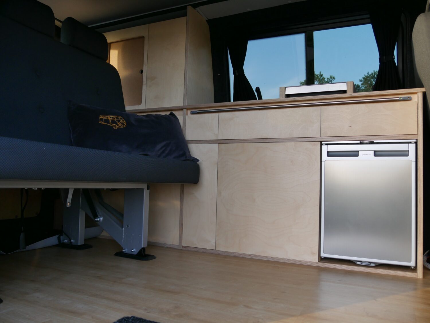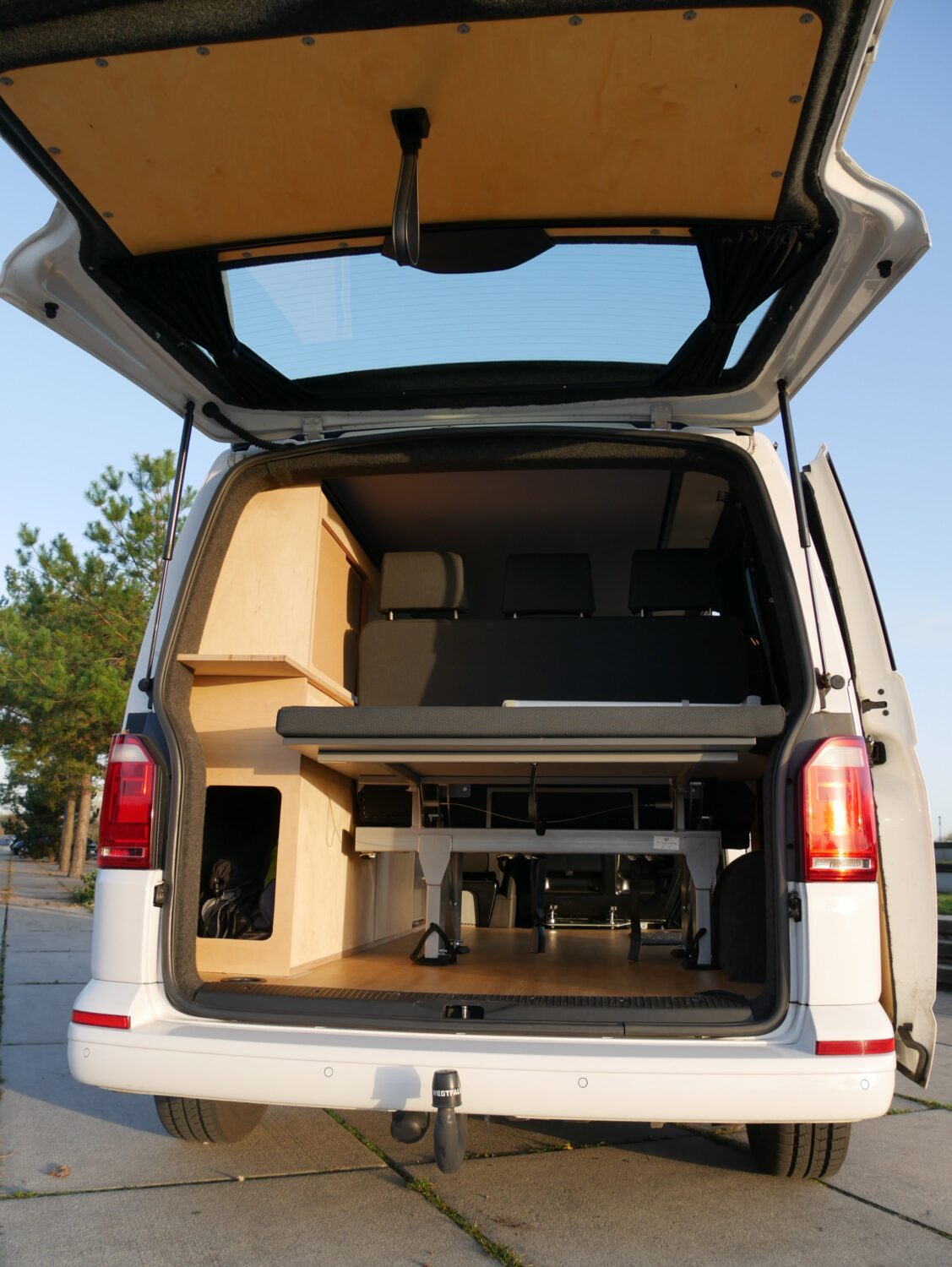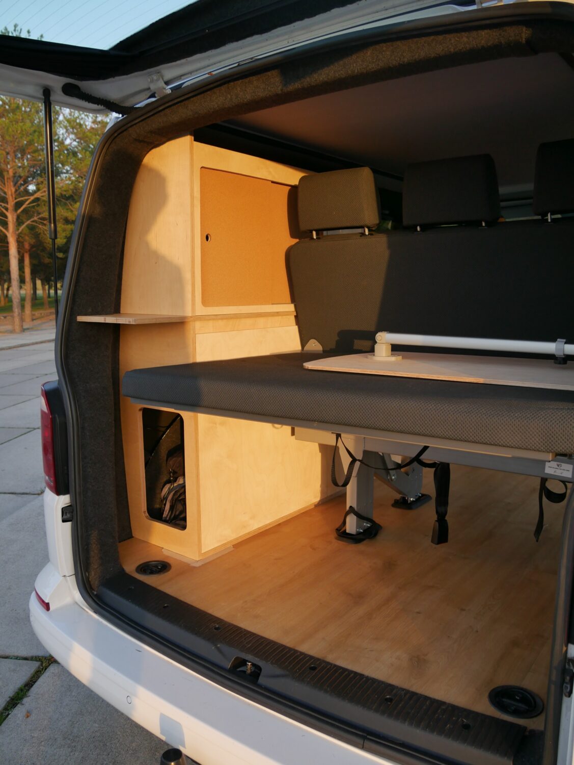 Der Ausbau hat ca. 1 1/2 Jahre gedauert. Bis auf die Sitzbank, Aufstelldach und der Standheizung ist der Ausbau in Eigenregie erfolgt.
