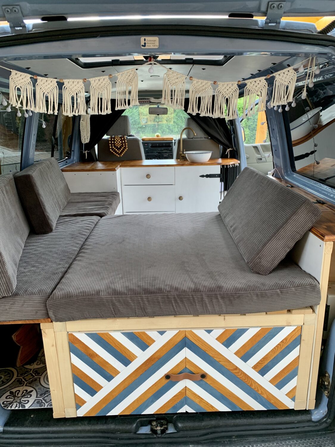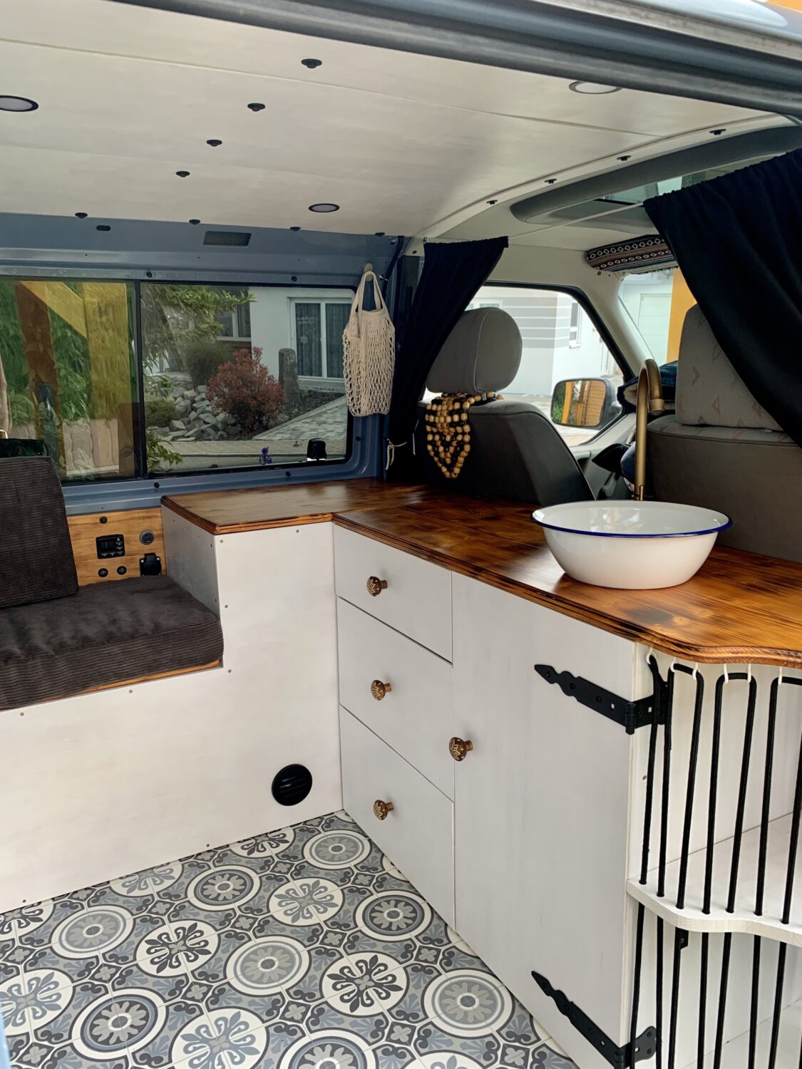 Wir sind „fertig- mit dem Ausbau insofern man das sagen kann 😬 wir haben Strom an Bord und können unsere Zweitbatterie am Landstrom oder über die Lichtmaschine lade hat uns bisher ausgereicht. Natürlich haben wir in unserer Küchenzeile auch fließend Wasser😜 die Hauptbauzeit ging ca ein halbes Jahr.