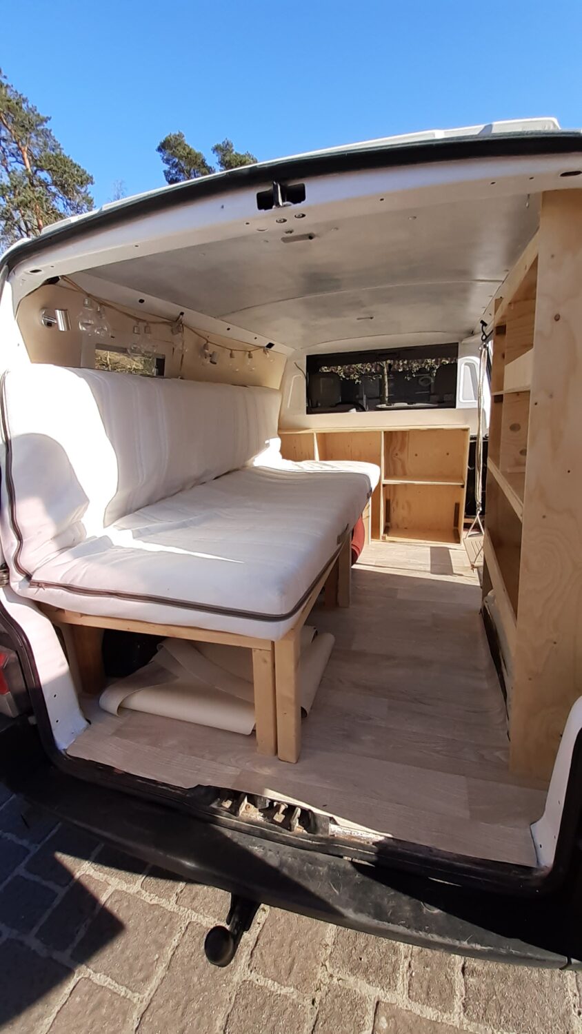 Ich habe meine Semesterferien im März genutzt und den Bus in entspannten 6 Wochen ausgebaut. Das System ist relativ einfach gehalten ohne viel Schnickschnack. Es musste Platz für 2 Hunde bleiben, was beim Ausbau nicht unbedingt einfach war umzusetzen. Außerdem kann ich das Bett und den Schrank in 2 Minuten raus räumen und den Raum nutzen um große Teile zu transportieren. Mit allem Zubehör und Kleinteilen die über den Sommer noch hinzu gekommen sind bin ich jetzt bei ca. 1000 € für den gesamten Ausbau.