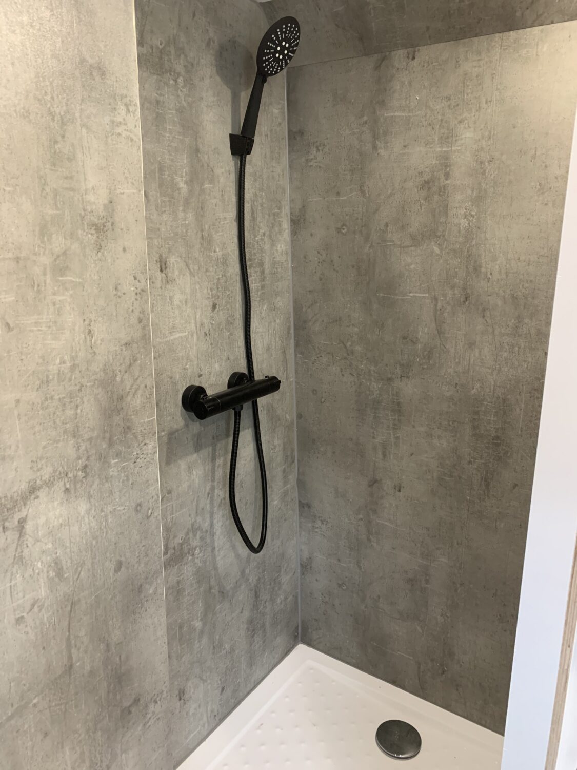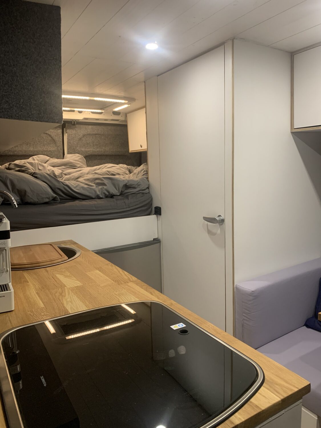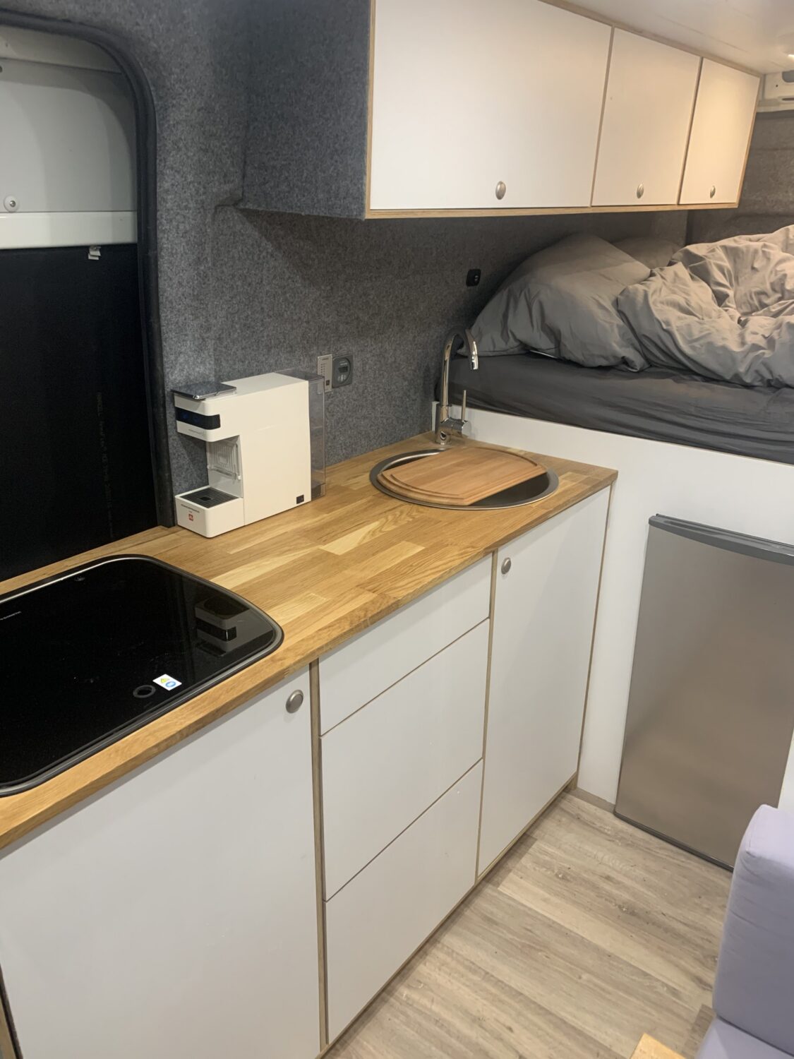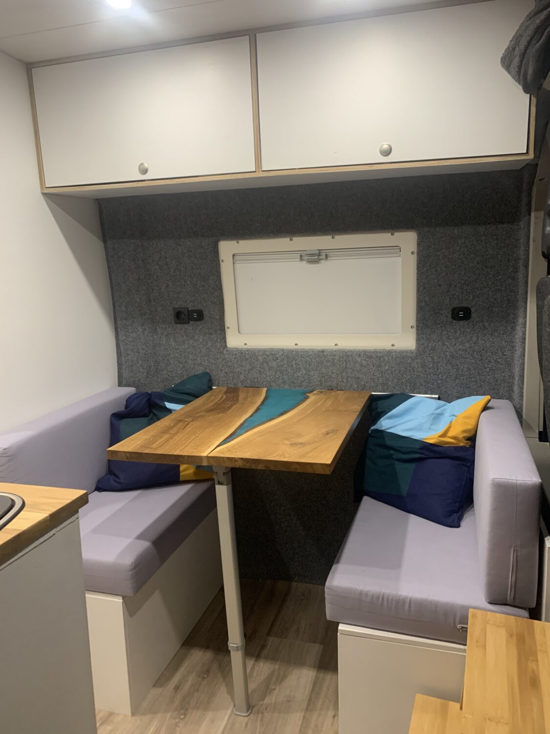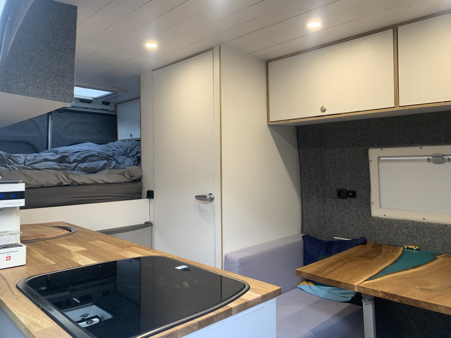Ich habe ca. 2 Monate für den Ausbau gebraucht. Eine Dusche ist auch verbaut. Ein Hingucker ist der Epoxidharz Tisch der super in das Bild passt. Kosten Van: 11.000€ Ausbau: ca. 13.000€