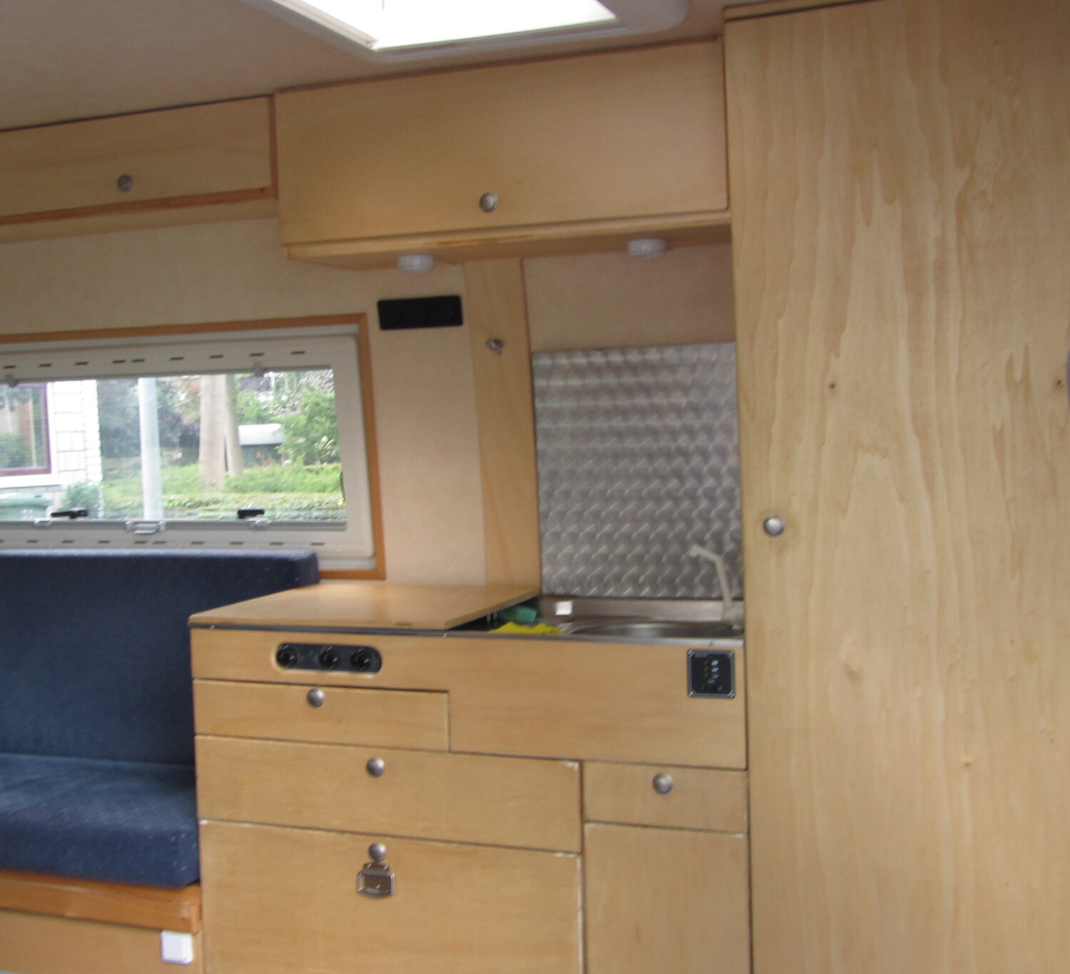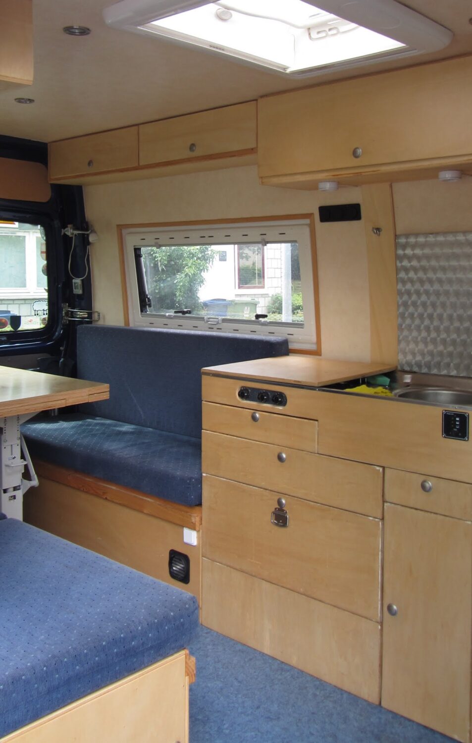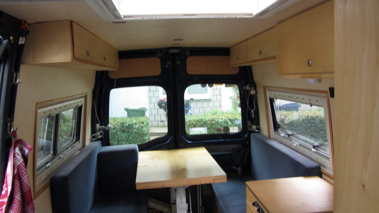 Kein Festbett und keine Dusche aber dadurch sehr geräumig, mit große Dinette und zu öffnen Hintertüren, ausgebaut mit laktiertem Pappelsperrholz