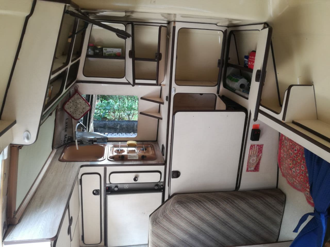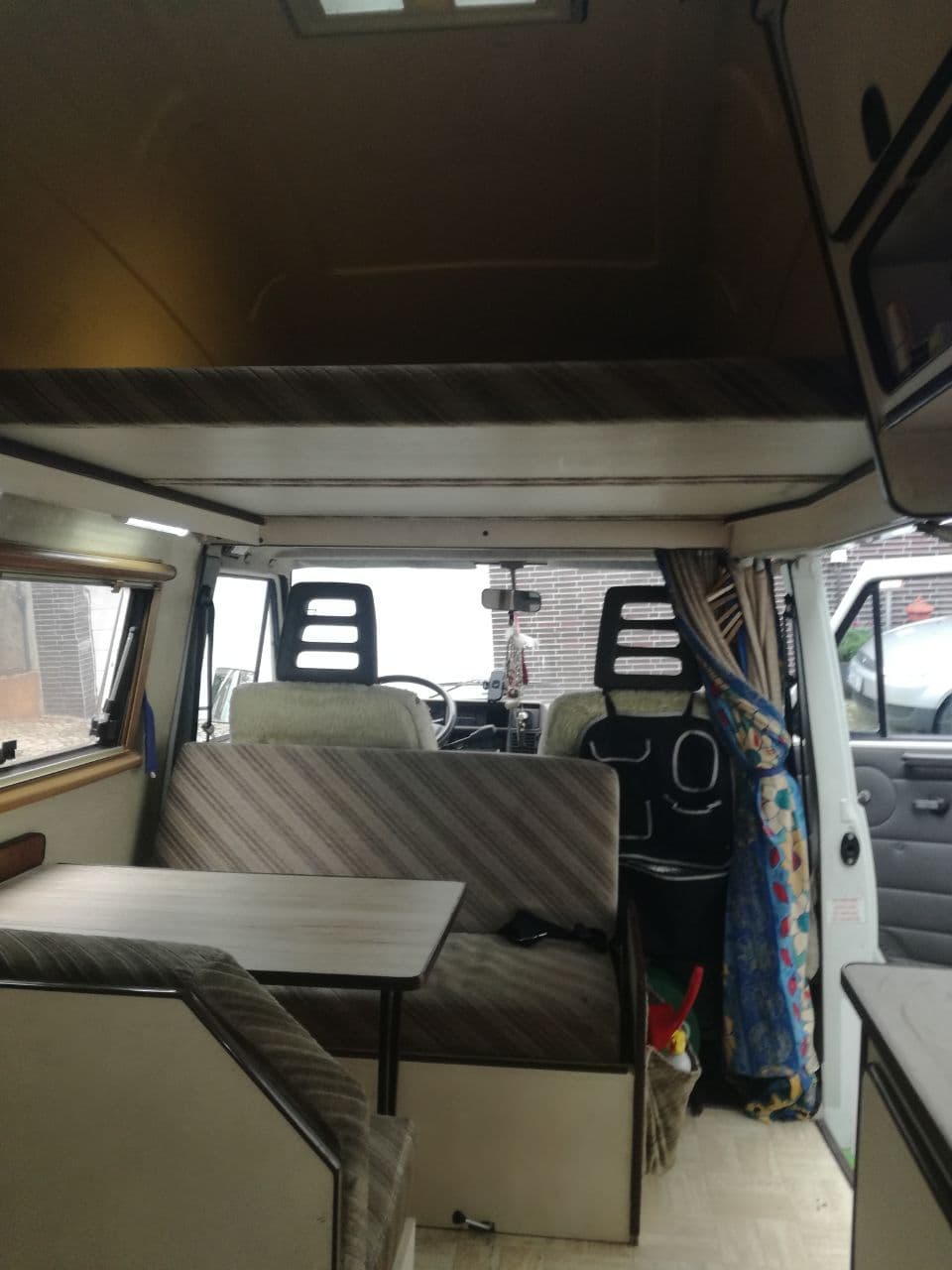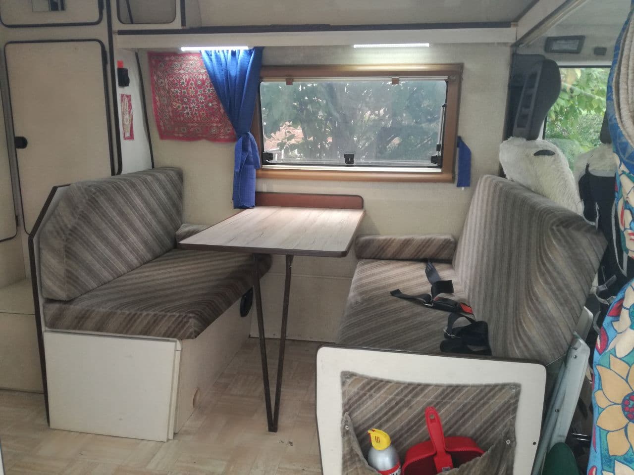 Der Campingbus hat vier eingetragene Sitzplätze und bietet auch vier Schlafplätze (zwei oben, zwei unten). Zu der Inenausstattung gehören: - ein Kühlschrank (Gas und elektrischer Betrieb möglich) - ein Gasherd mit zwei Gasflammen - eine Standheizung (Gas) (zeigt in letzter Zeit einen Fehler an, dürfte aber kein großes Problem sein) - diverse Schränke und Stauraum unter den Sitzbänken hinten - großes Vorzelt.