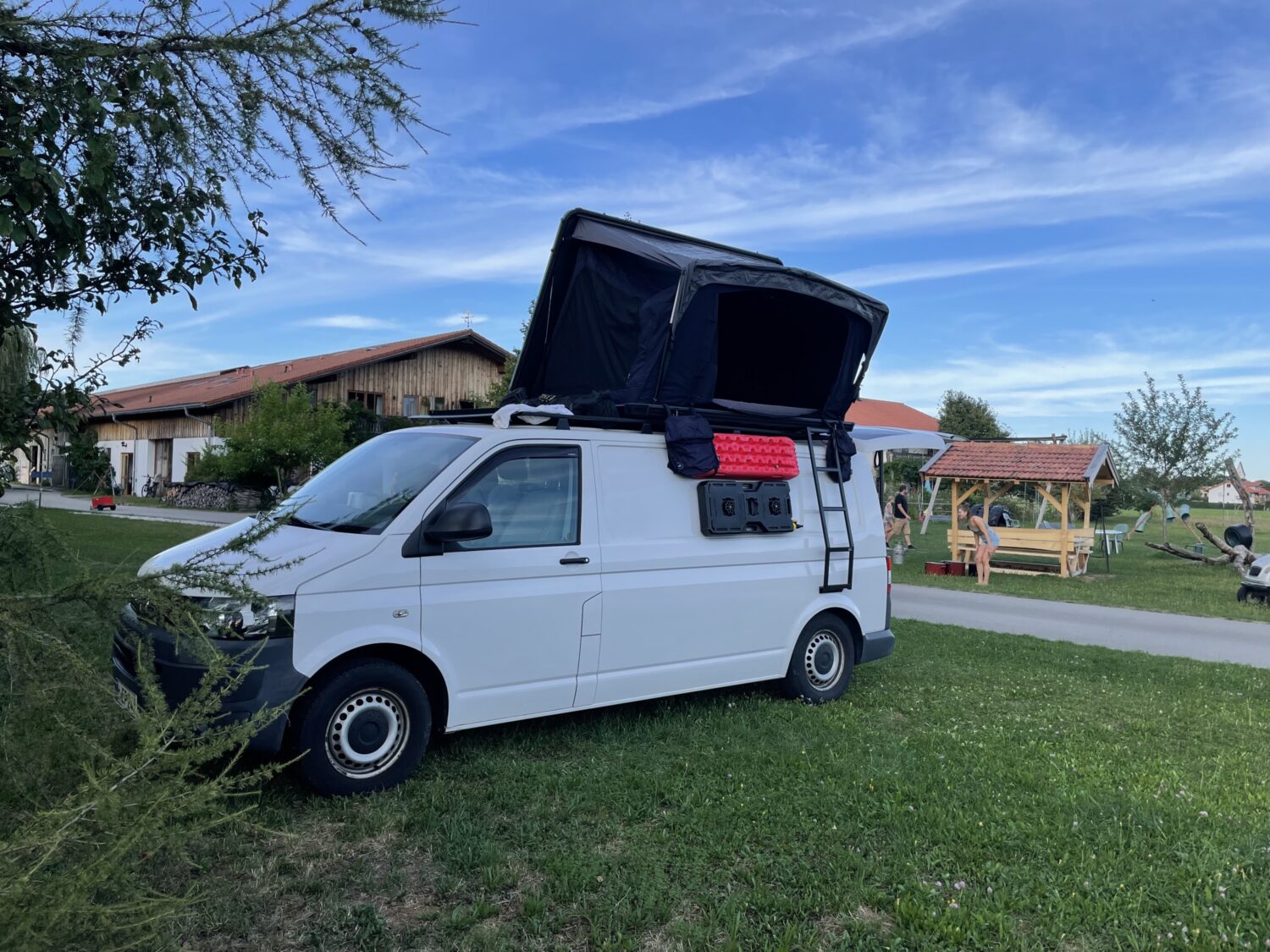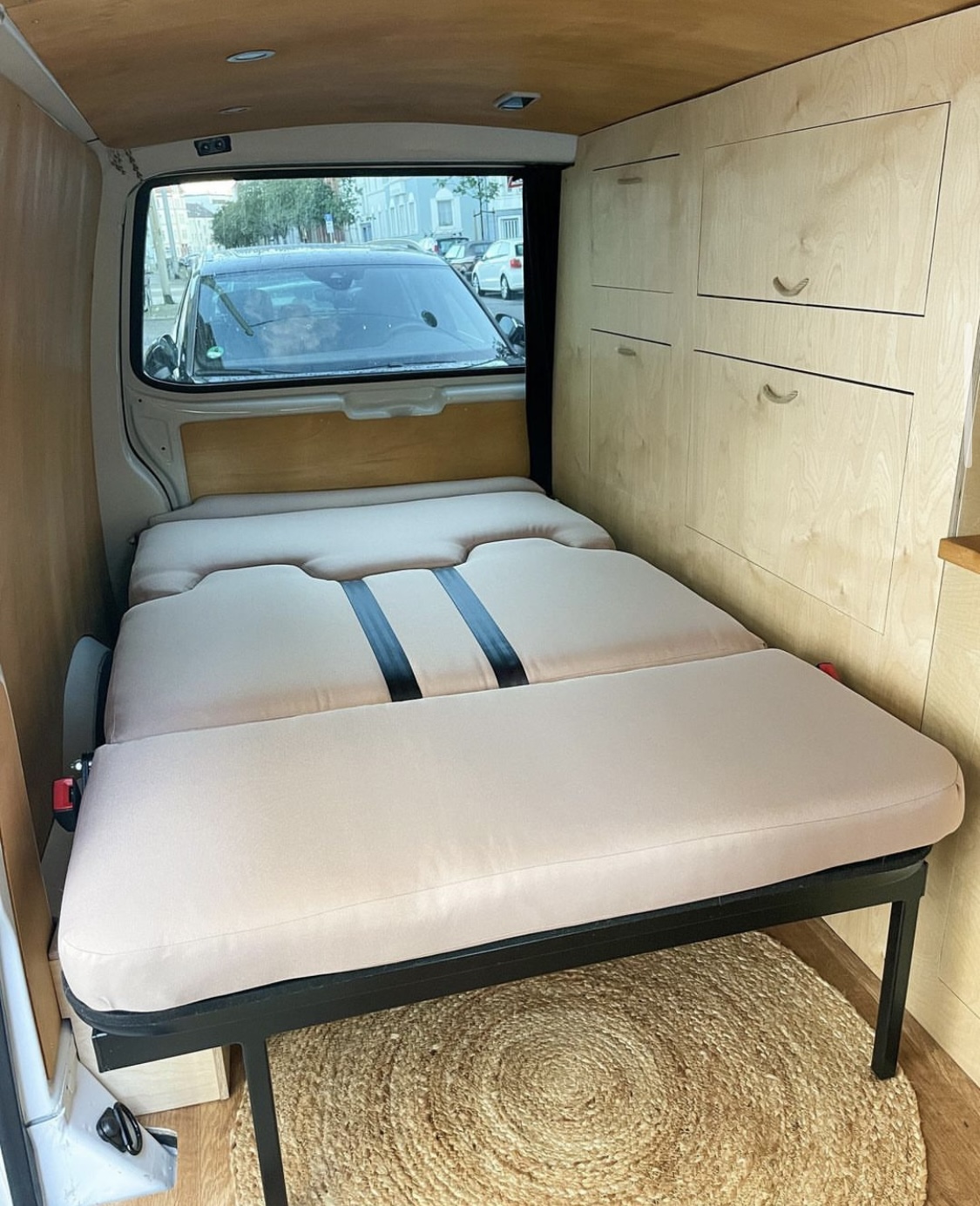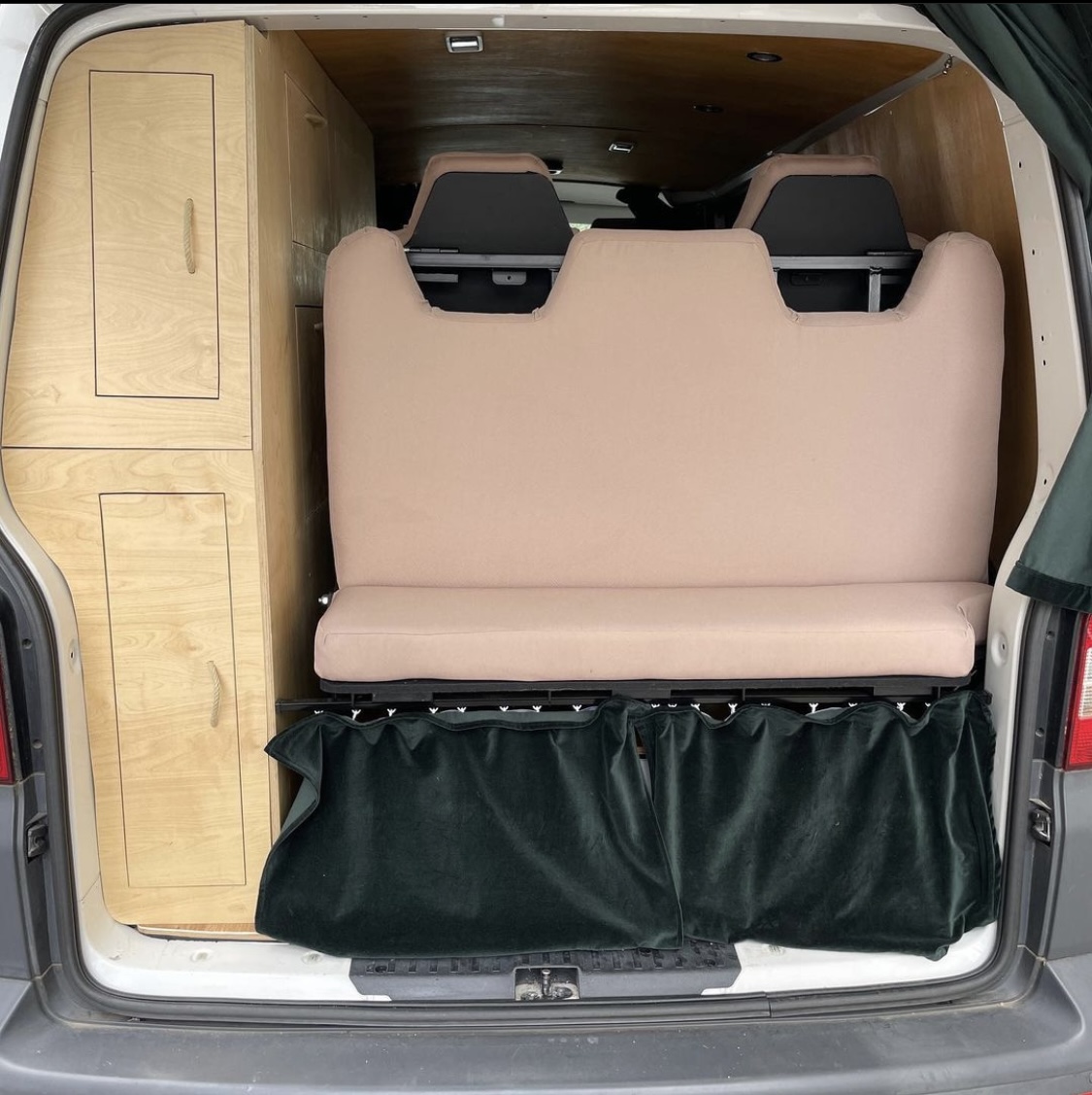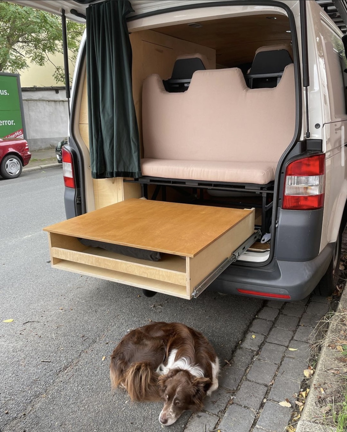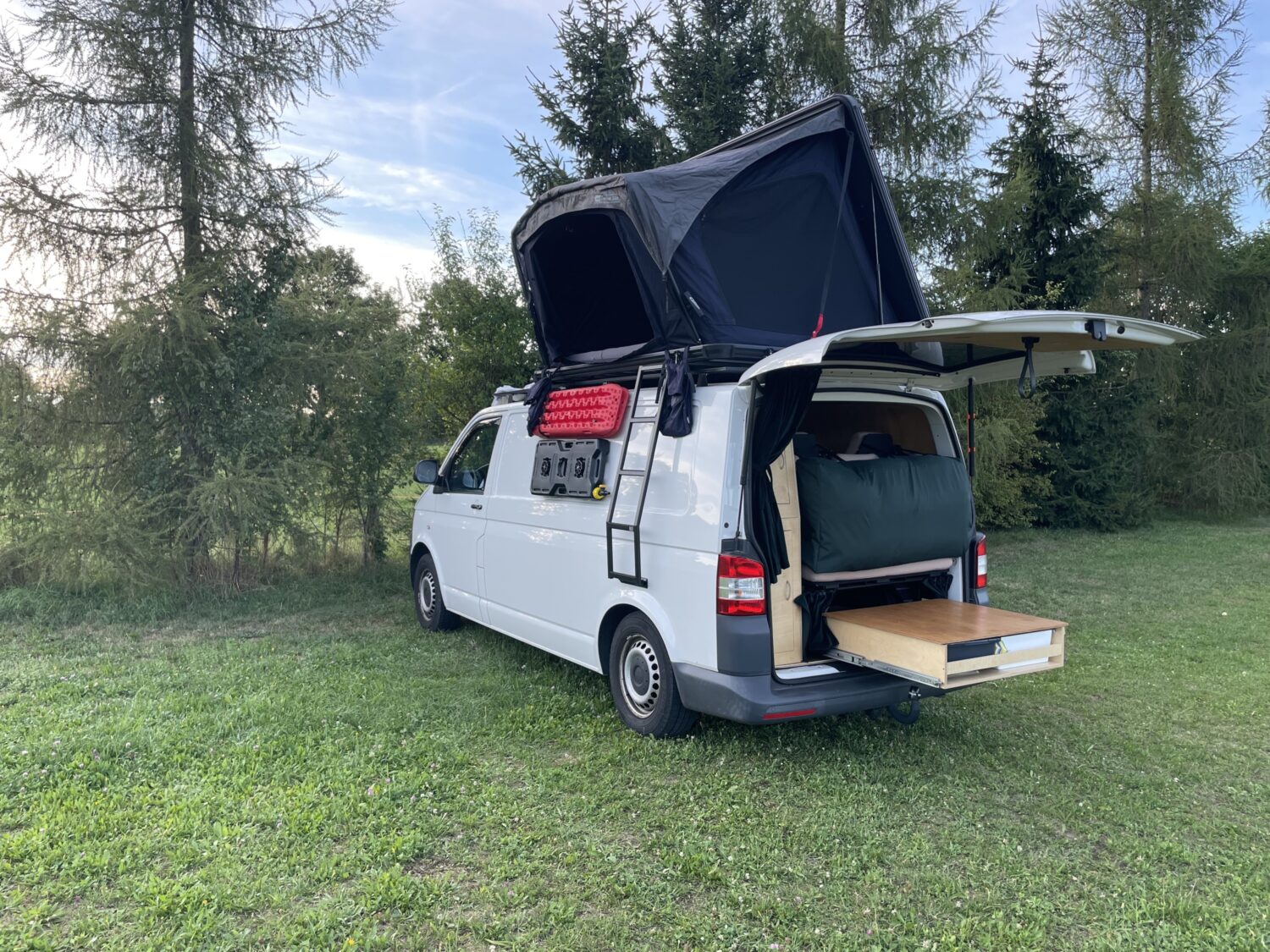 VW T5 Camper mit vier Schlafplätzen und bis zu 5 Sitzplätzen, selbst ausgebaut