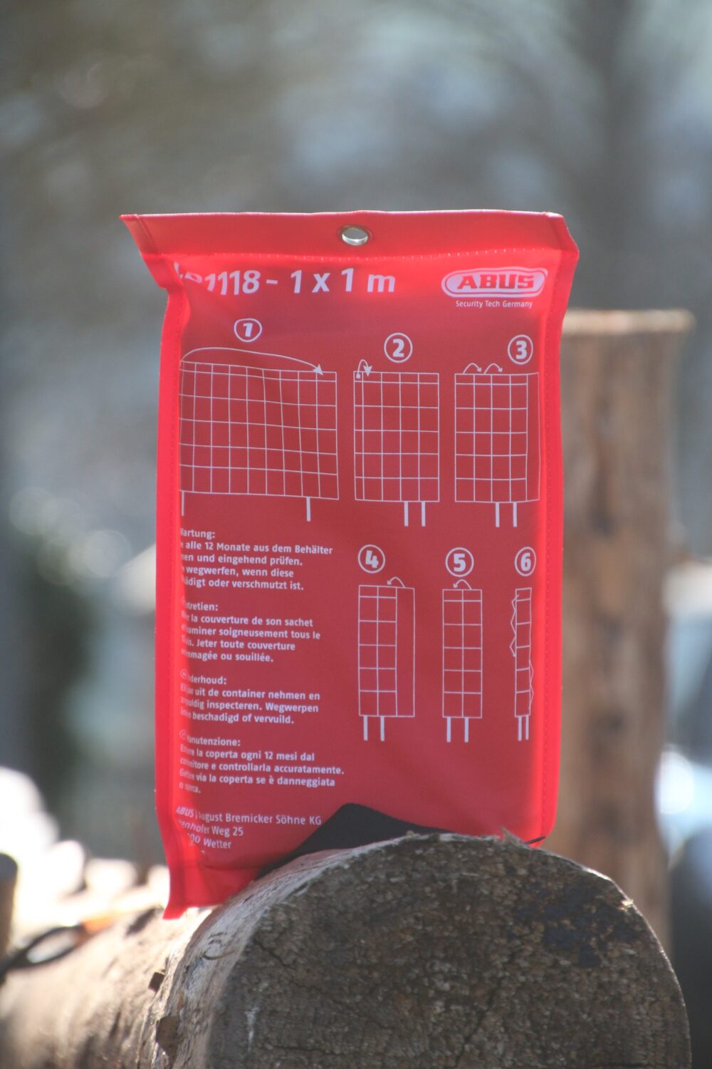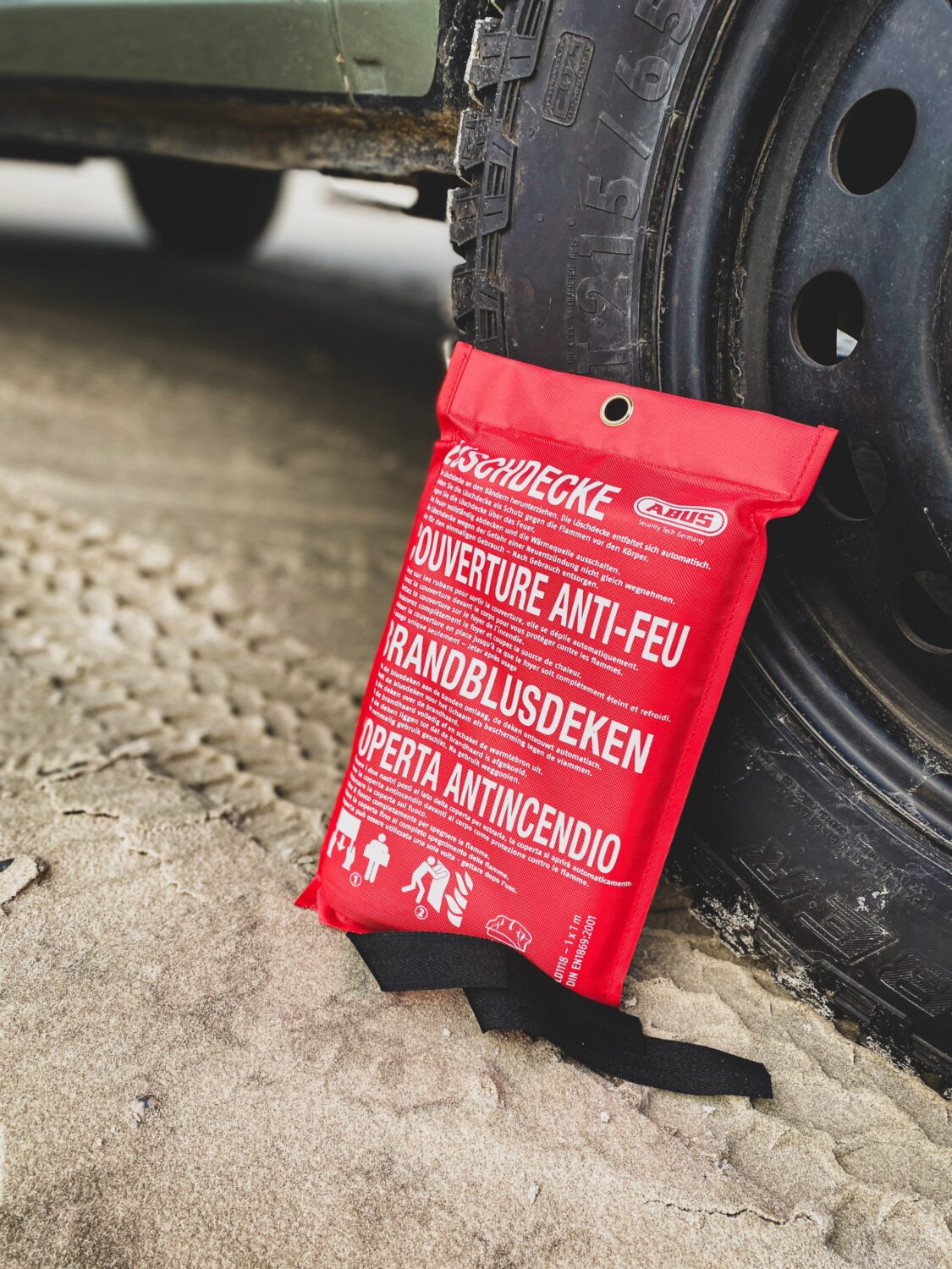 Das nächste Produkt, welches wir euch aus der Reihe „Sicherheit im und am Van“ vorstellen möchten, ist die Feuerlöschdecke LD1118. Die Decke misst 1×1 Meter und ist damit eher für kleine Flächen geeignet. Für den hier gewählten Einsatzzweck ist sie aber dennoch groß genug. Alles was größer wäre benötigt mehr Stauraum und trägt zusätzlich zum Gewicht bei. Die Decke hilft dir dabei kleinere Fettbrände im Keim zu ersticken, die beim campen ja doch recht fix entstehen können. Einmal kurz abgelenkt und die Pfanne mit dem heißen Fett ist in Brand geraten. In dem Fall, Decke raus (an beiden schwarzen Bändern ziehen) und über den Brandherd werfen. Da die Decke aus einem speziell beschichtetem Glasfasergewebe besteht erstickt sie den Brand sehr schnell. Wichtig zu wissen ist, dass die Decke nur zur einmaligen Anwendung bestimmt ist, da sie nach dem Einsatz ihre ursprüngliche Schutzleistung verliert.